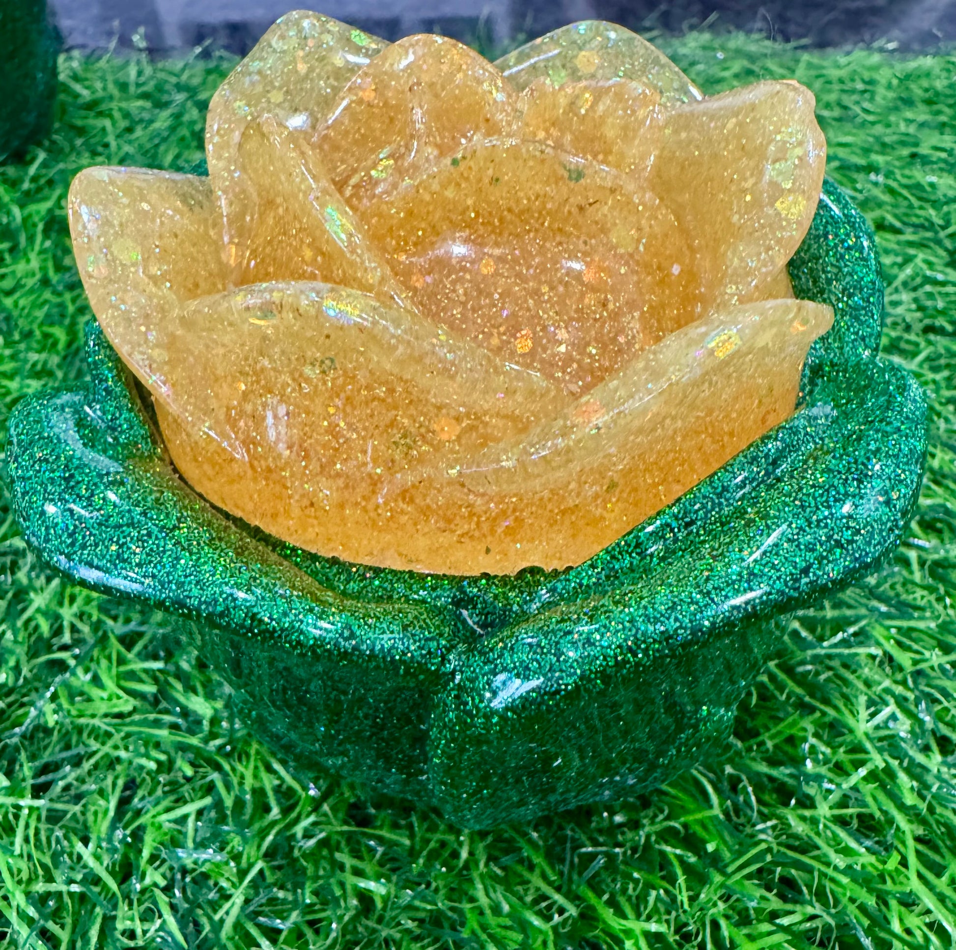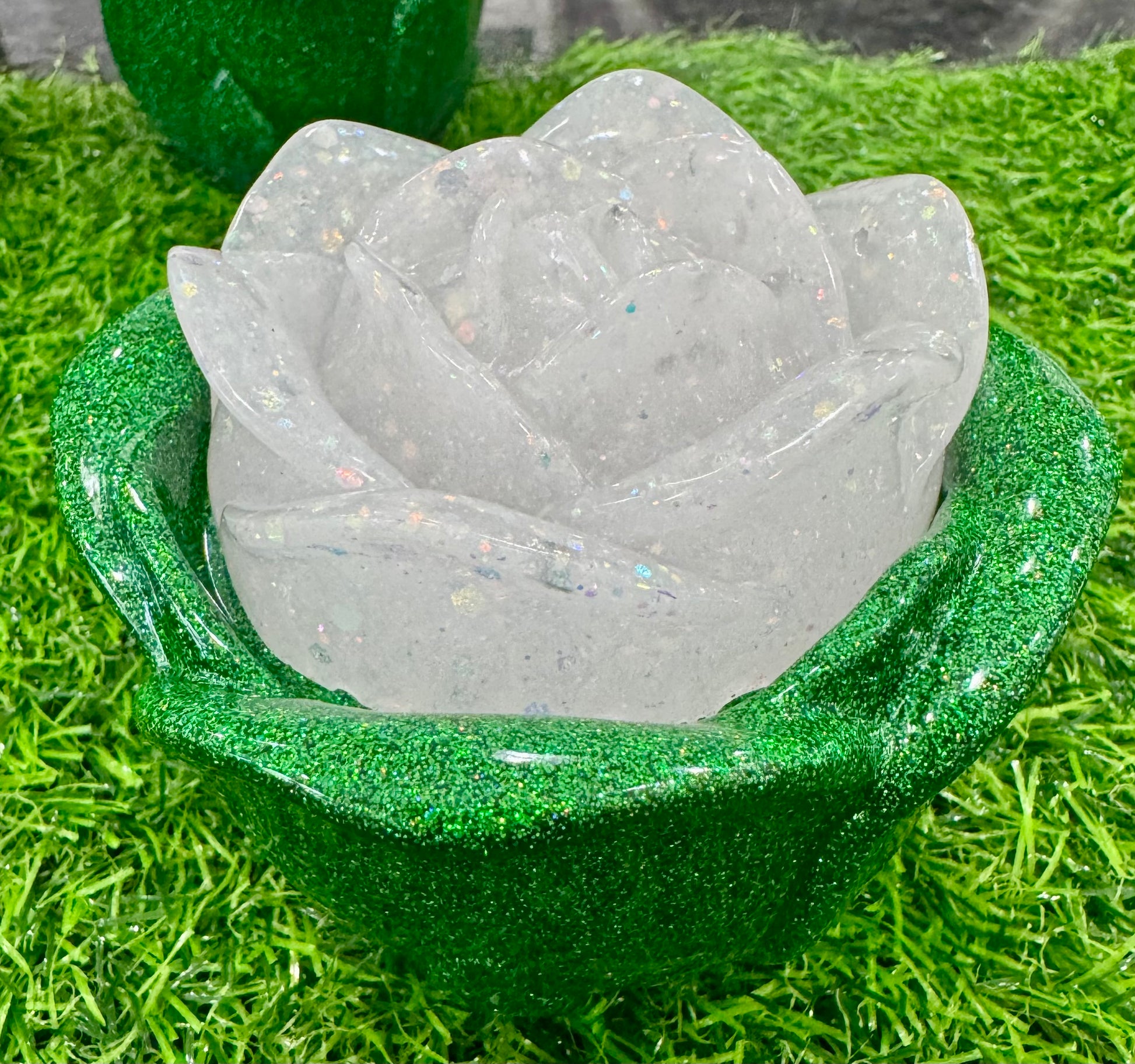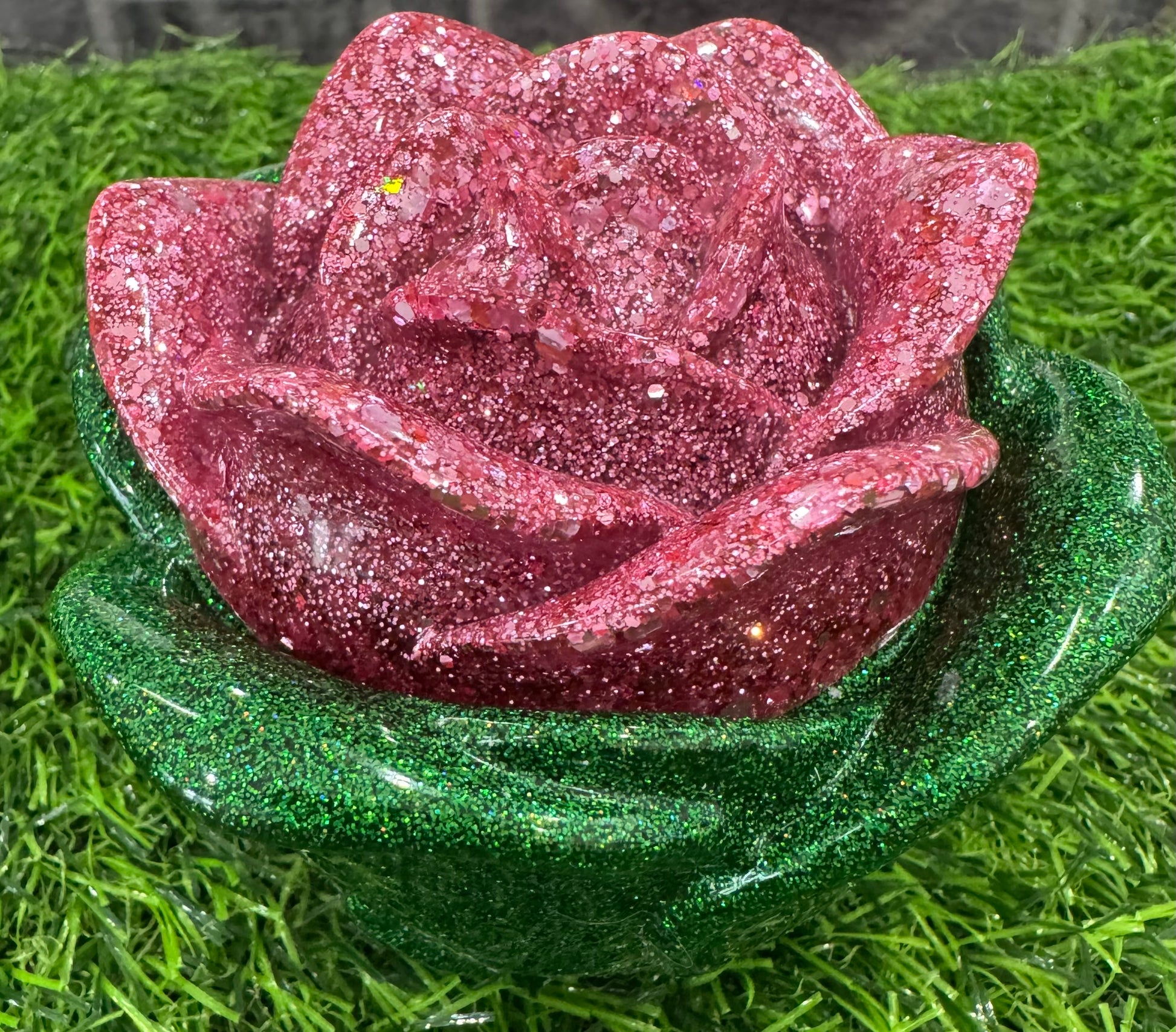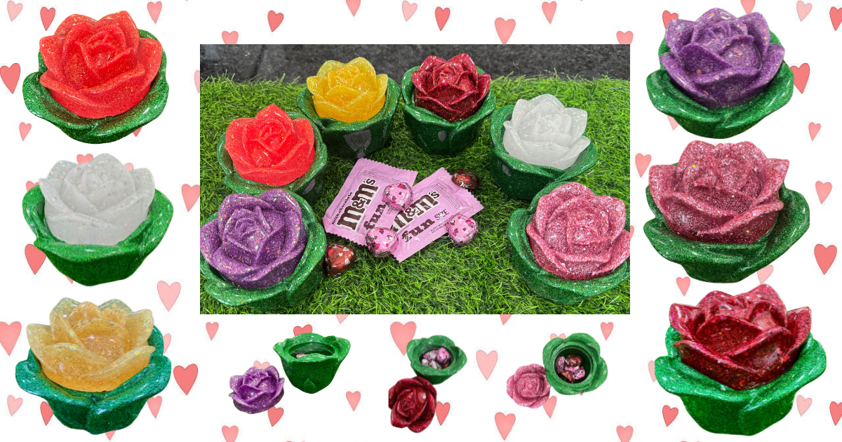 Looking for a little something special and different? This rose without thorns is handcrafted from resin. It is approximately 4 inches wide and 3.5 inches tall. It will hold a variety of items from candy, paper clips, change or hair-ties! The rose jar with lid is shown with 5 pieces of DOVE chocolate. Candy not included. Makes the perfect little gift for friends, coworkers, family or teachers!