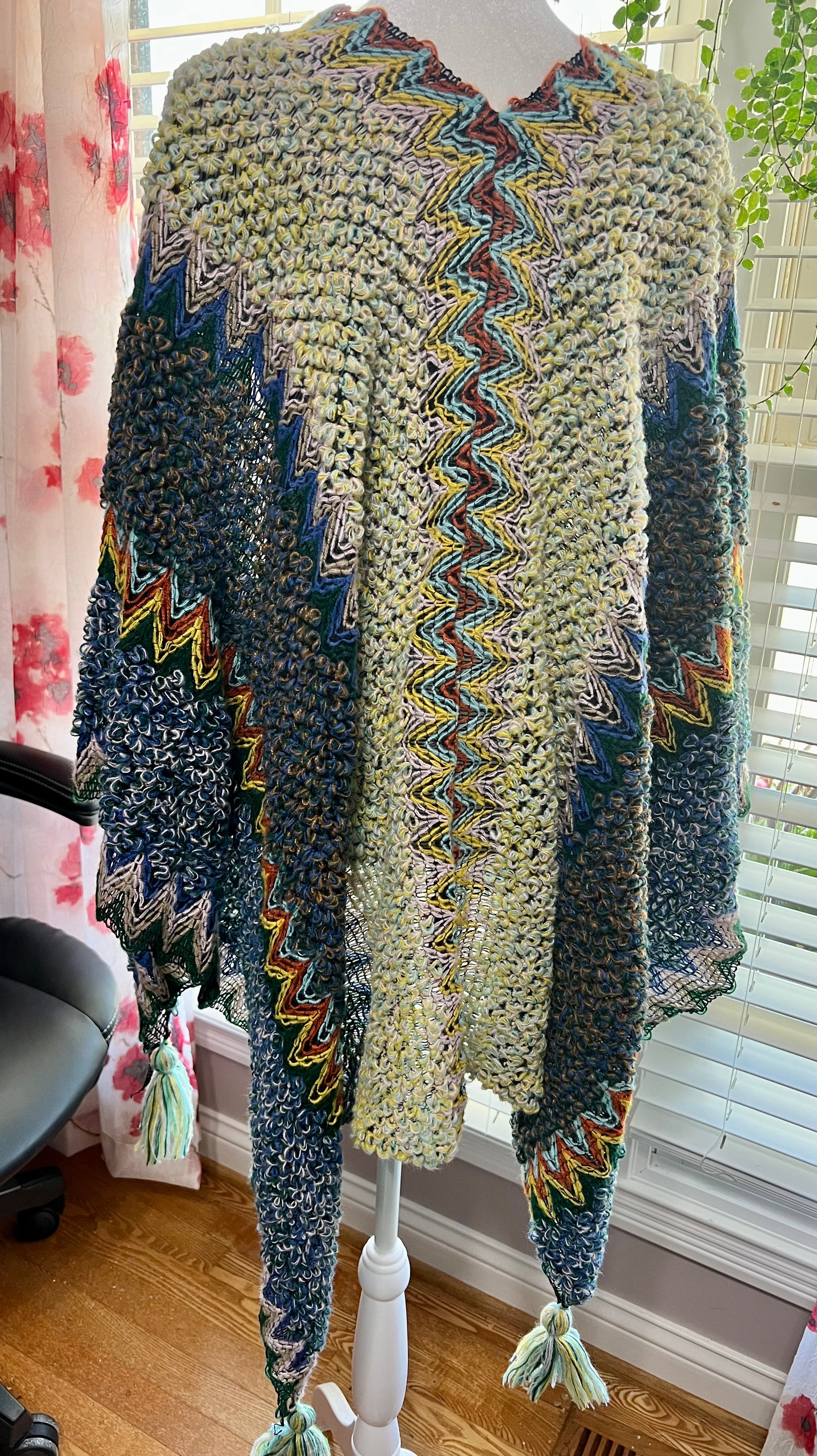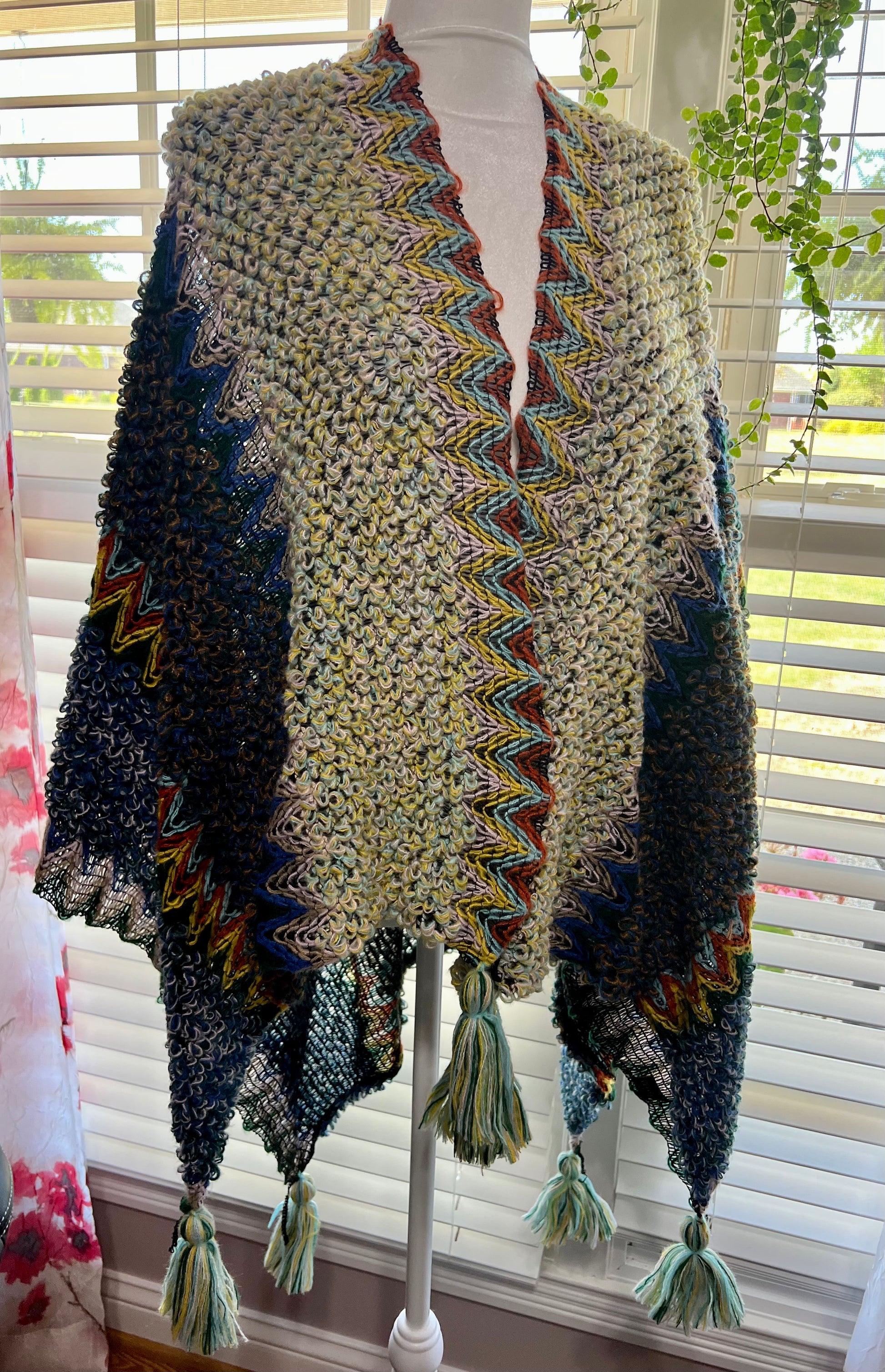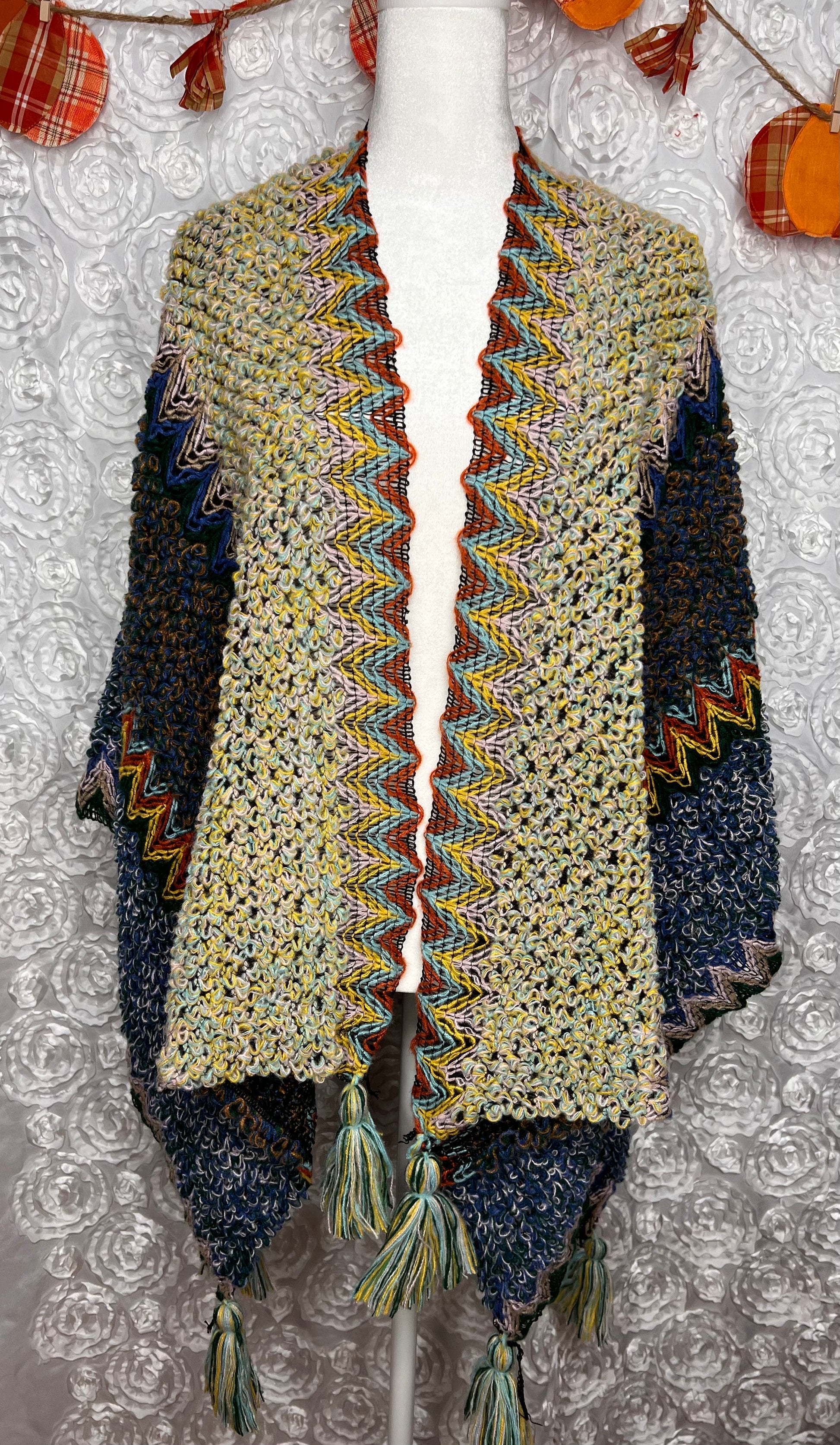 Available in two color schemes.. Teal and Yellow. Cashmere and silk blend. Notched at the beck in the back for the perfect shoulder drape.