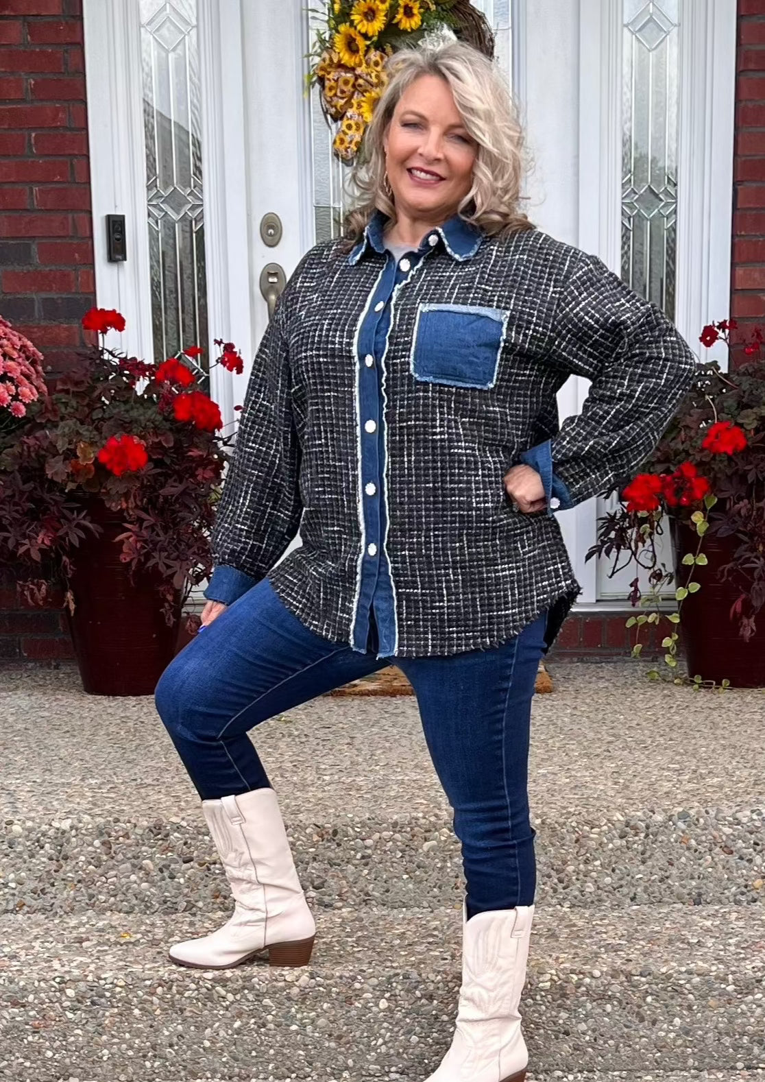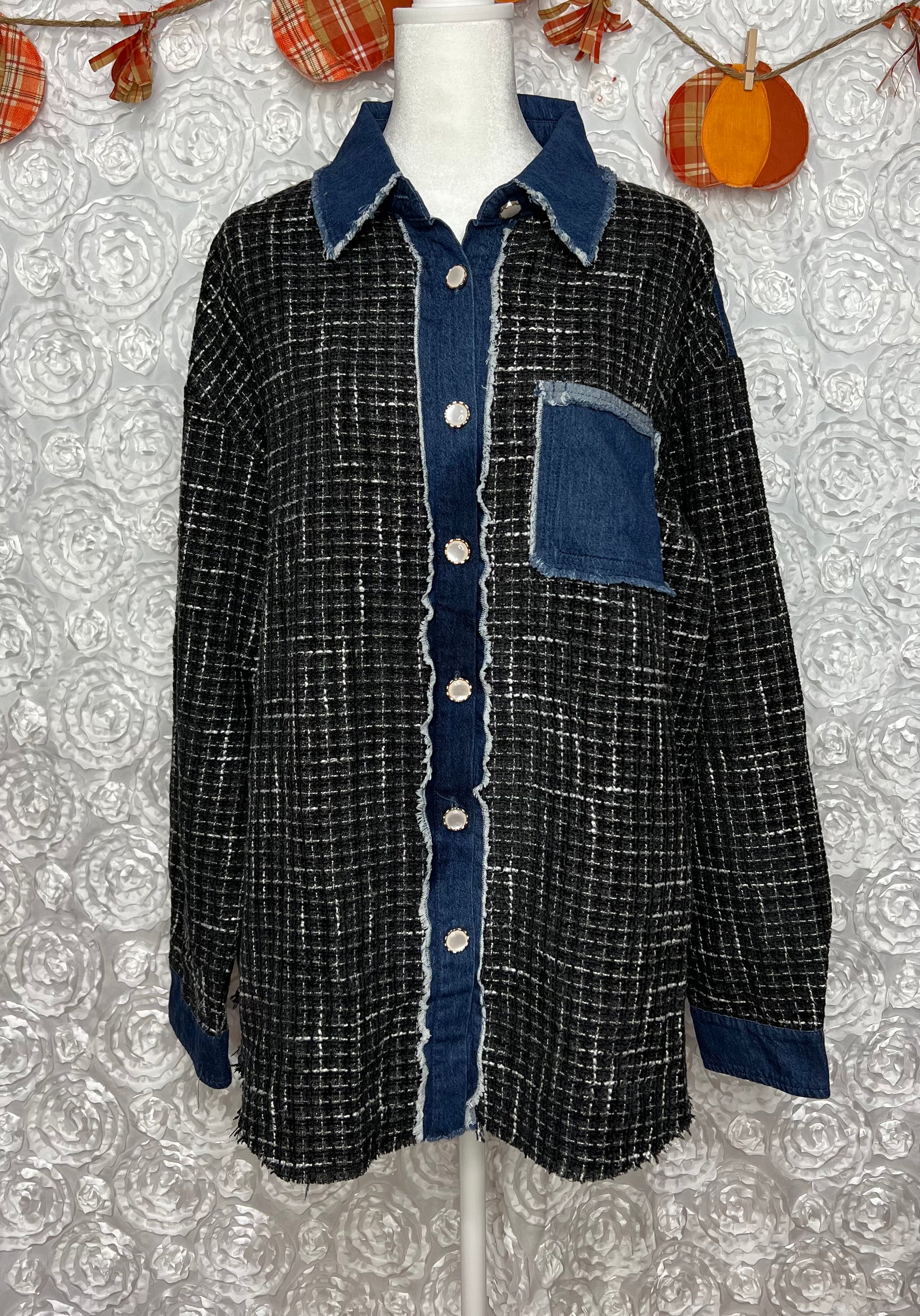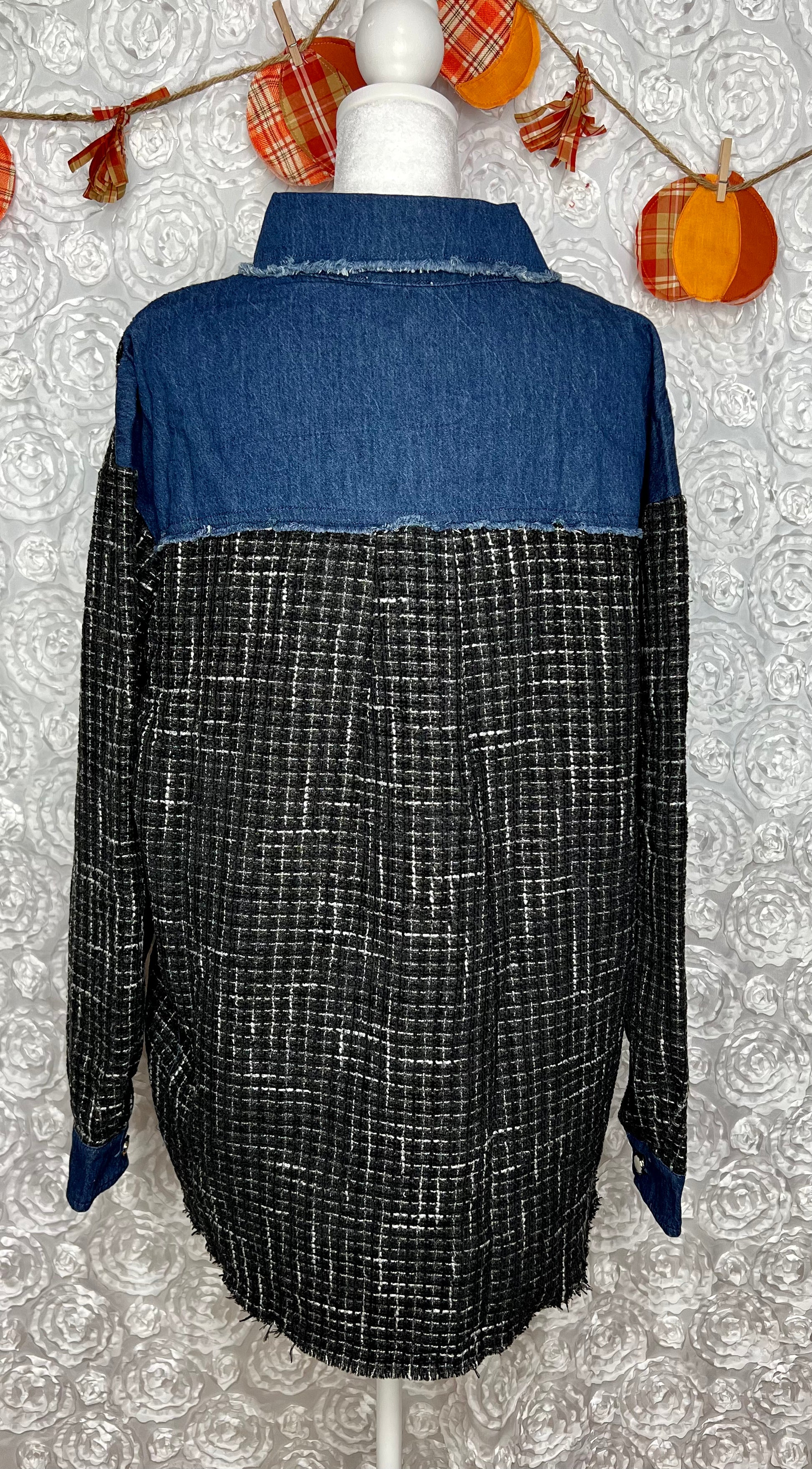 Plaid Collared Shacket with denim and pearl detailed buttons. Chest pocket and unfinished hem.