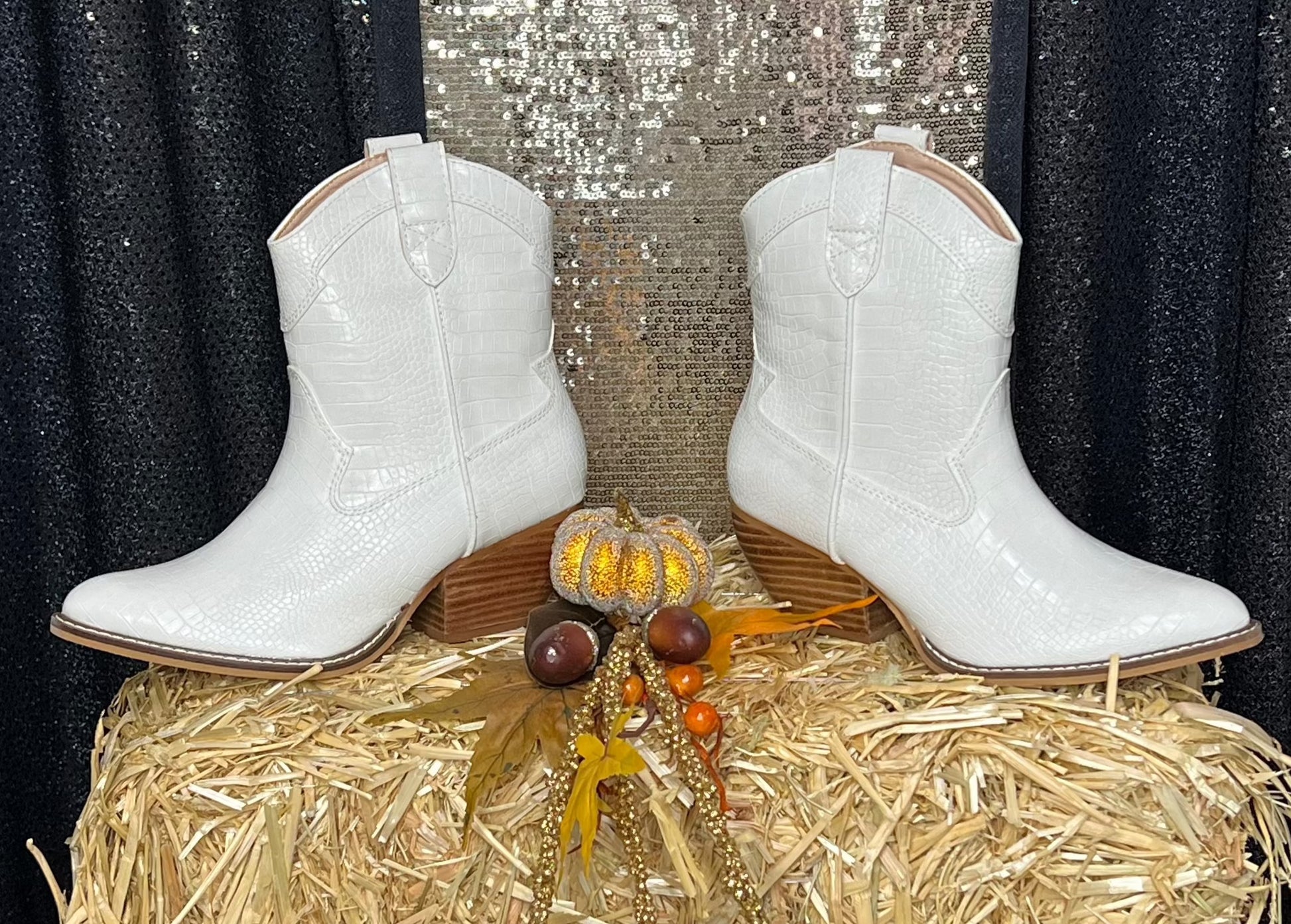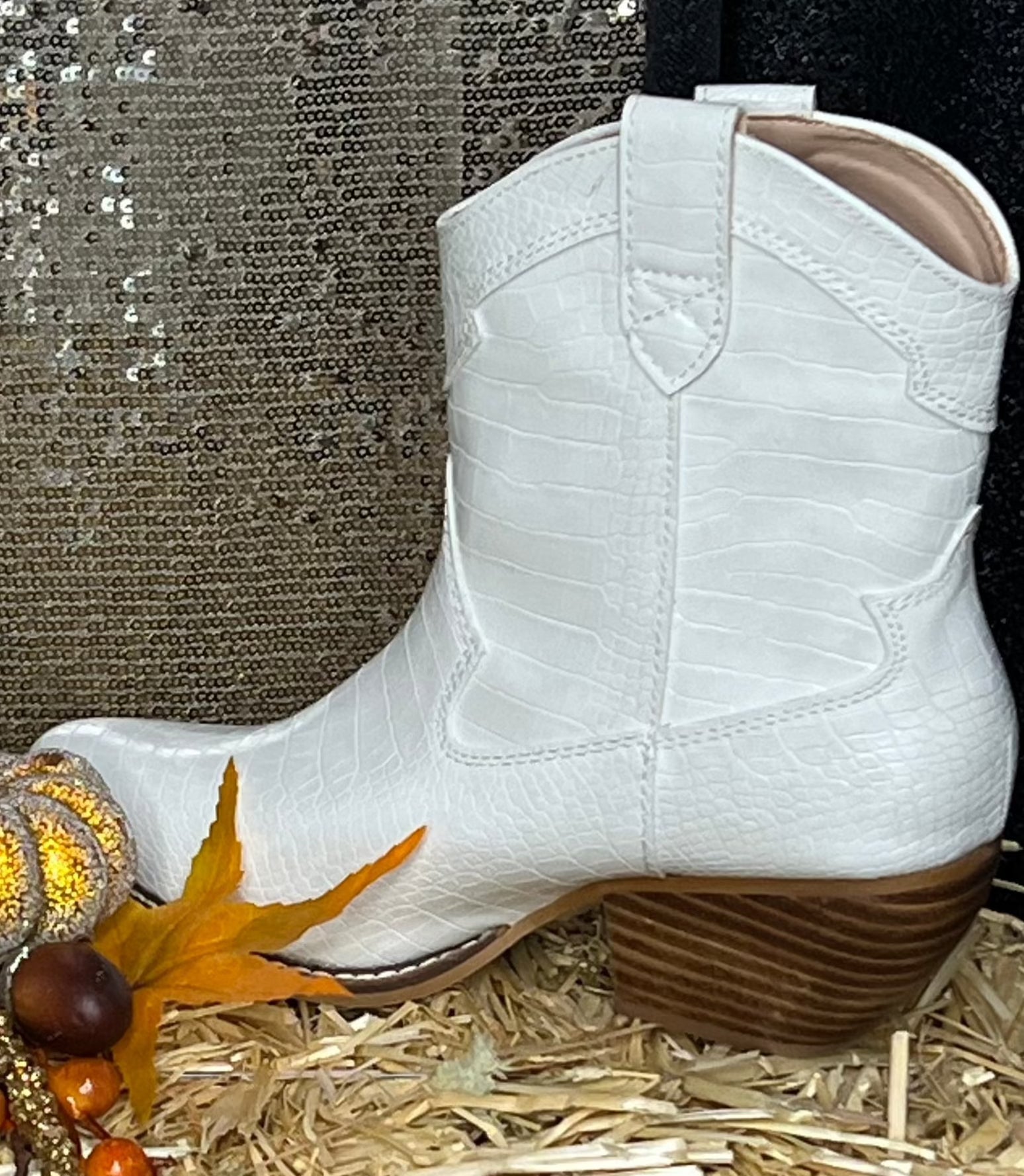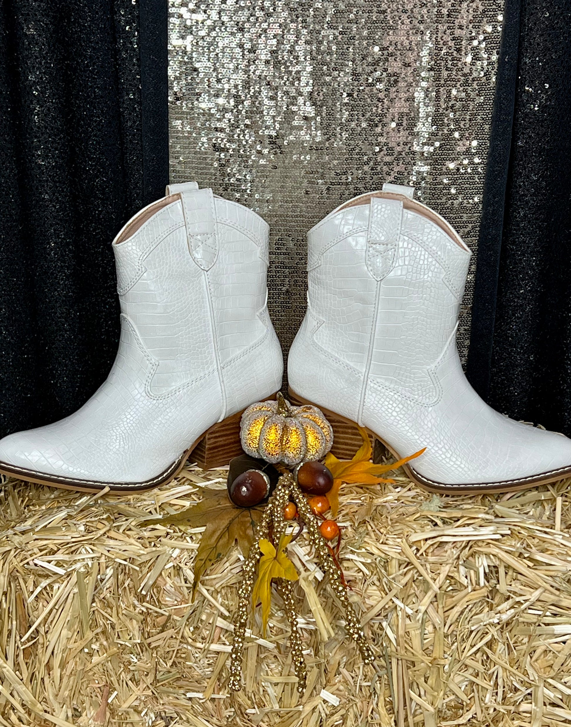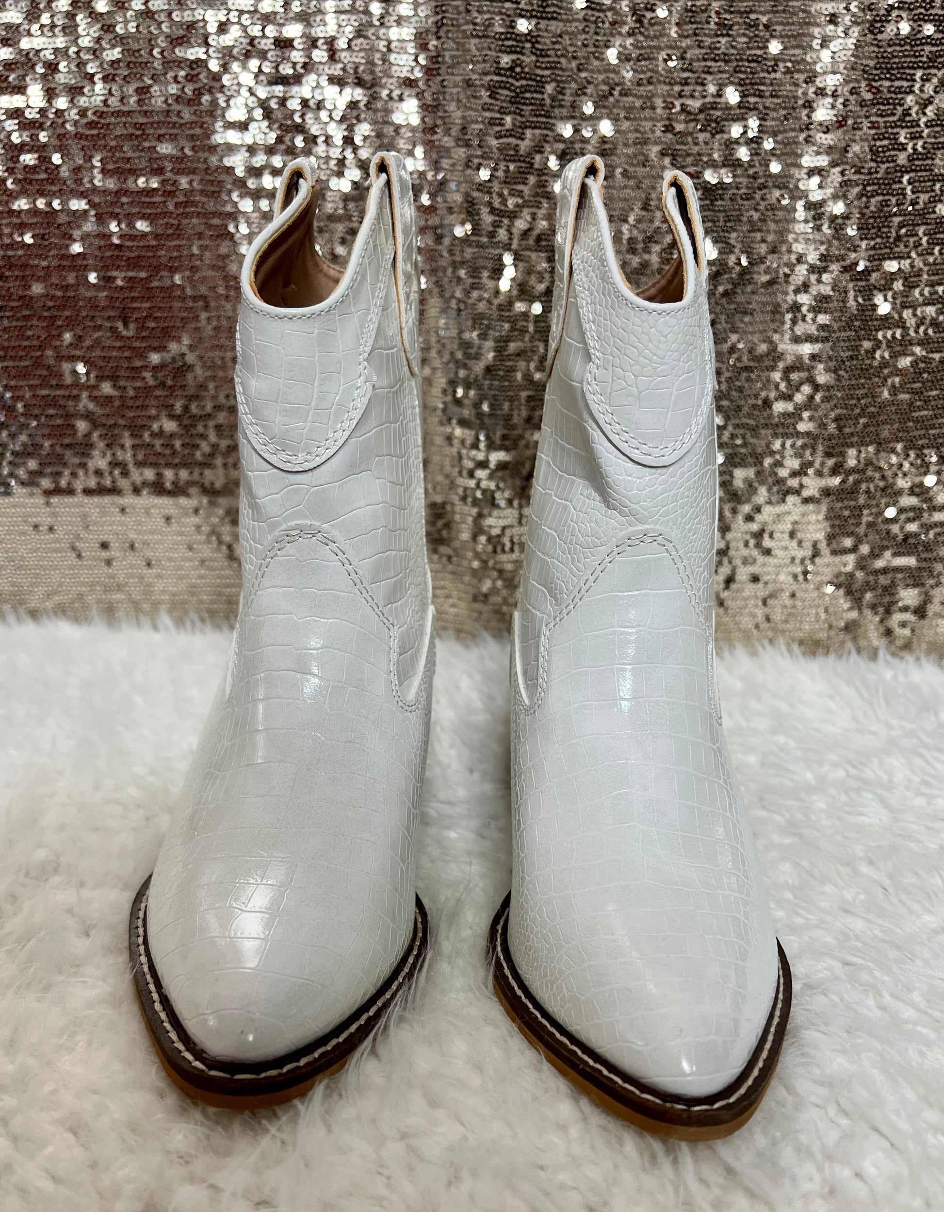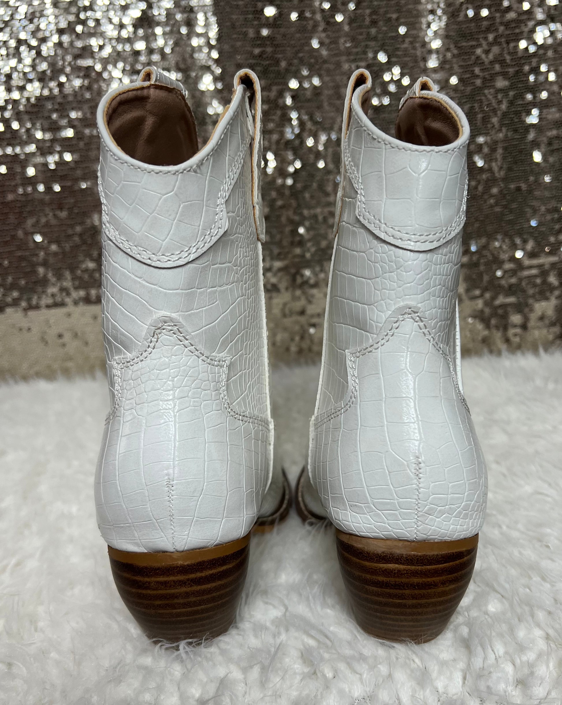 A super neutral white cream bootie. Lots of personality and style to this with the simulated crocodile pattern.