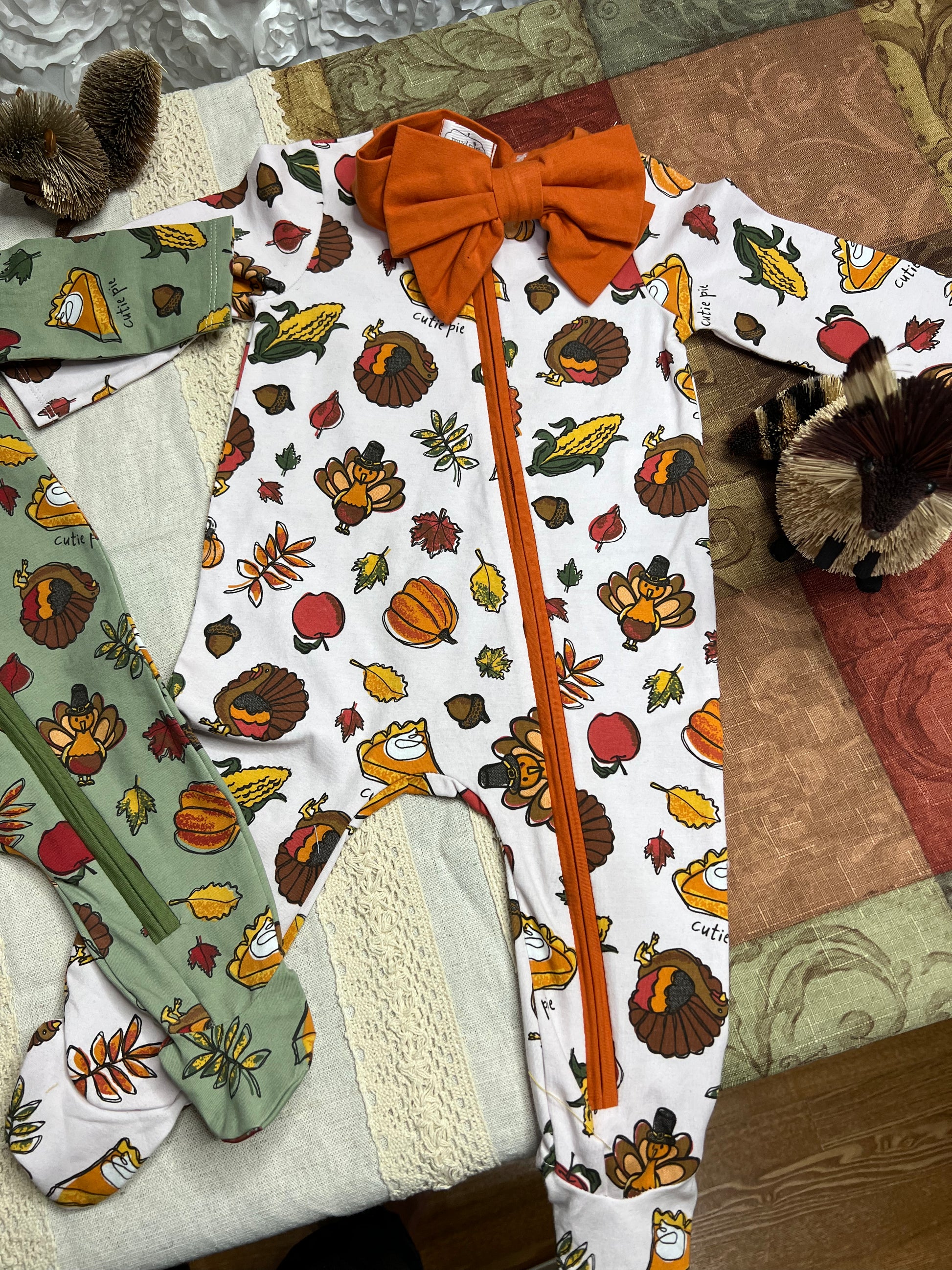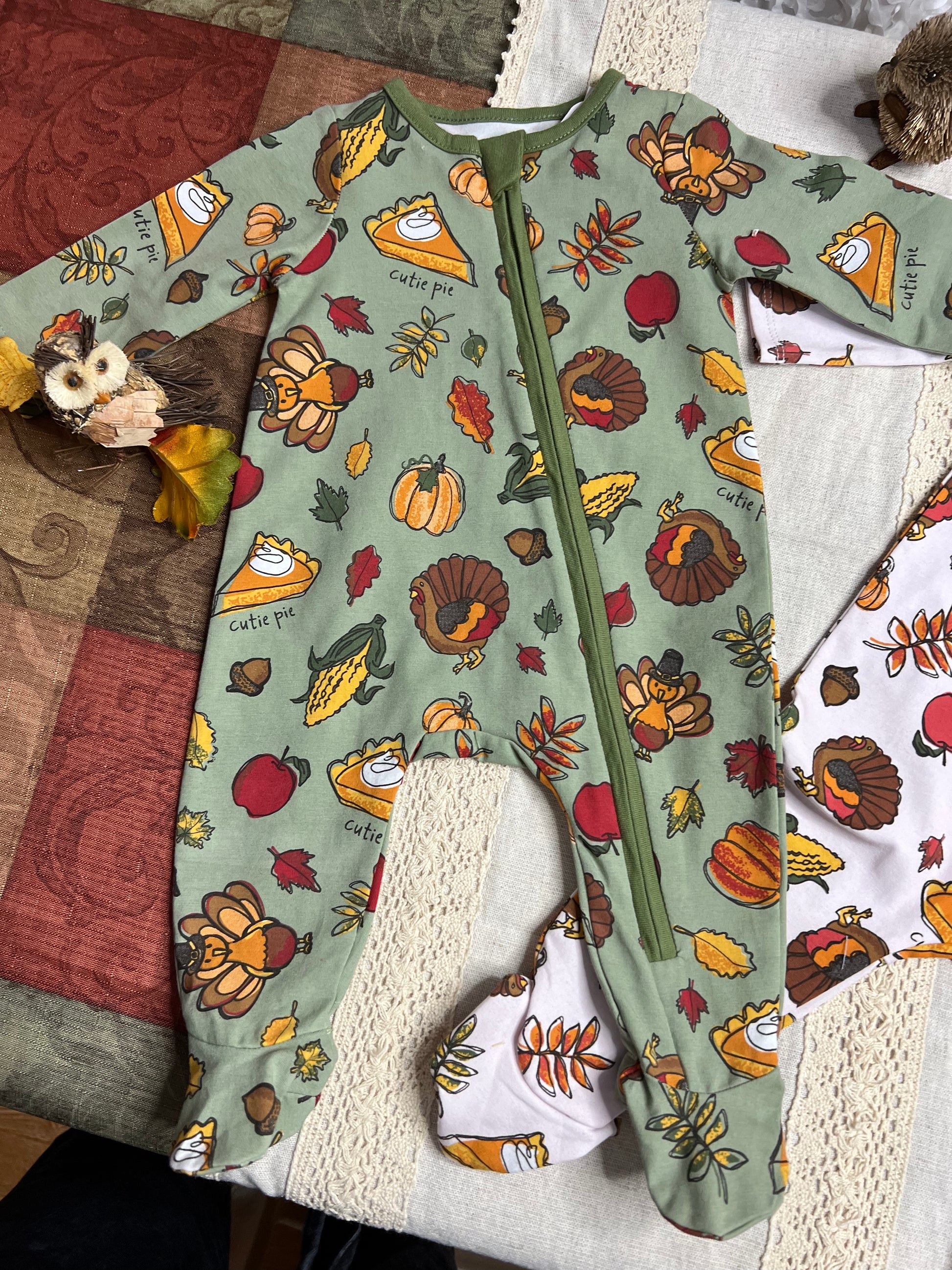 From Mudpie! Zipper front sleeper. 95% cotton and 5% spandex. And already decorated for Thanksgiving!