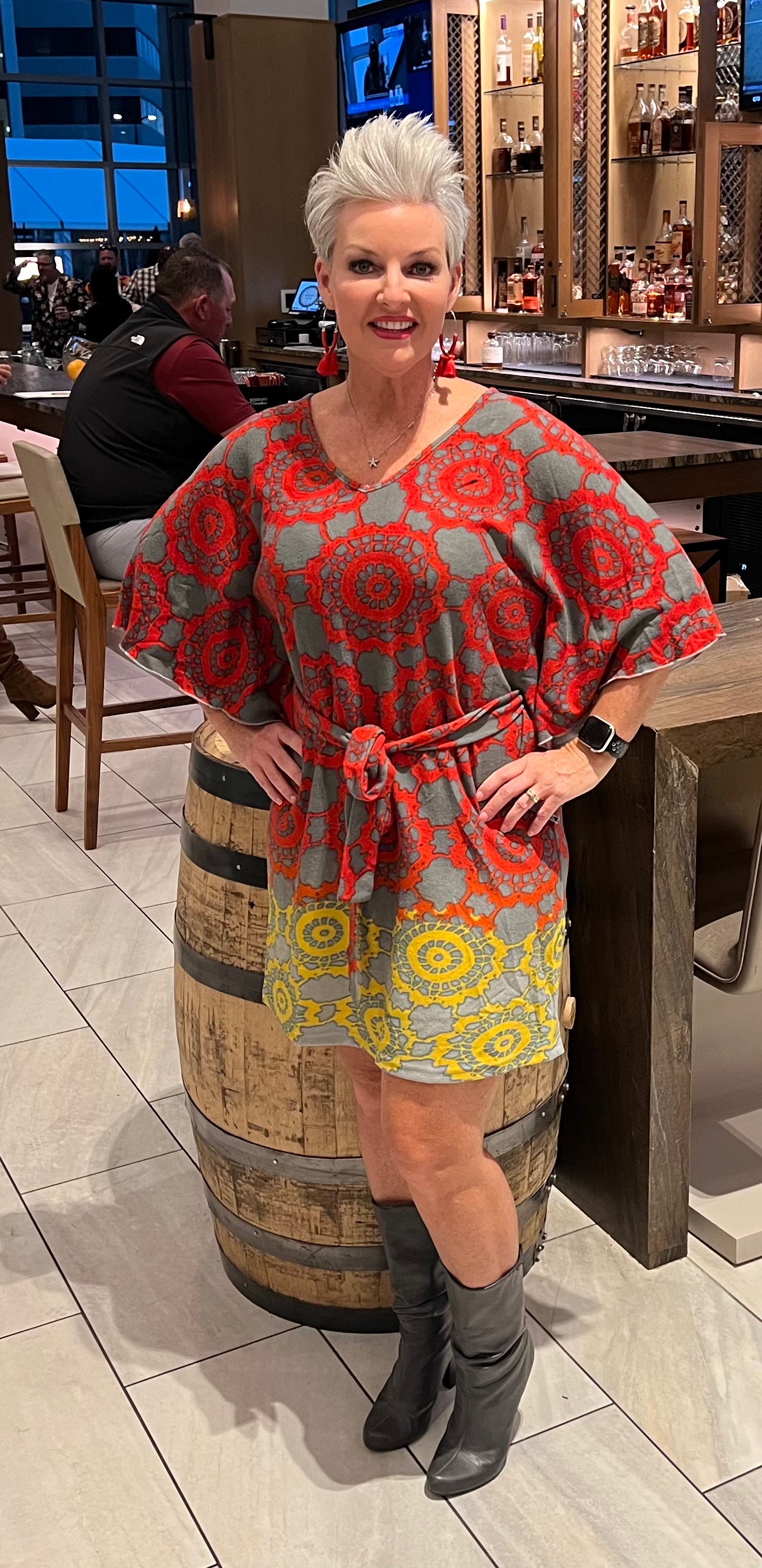 Knit t-shirt dress with flutter sleeves sewn perfectly for undergarment modesty. Rich gray, red, and yellows say wow. Draw tie belt accentuates your waist line while still giving you all day comfort. 100% polyester. Sizes available are 2X-4X but works like a one size fits most dress!