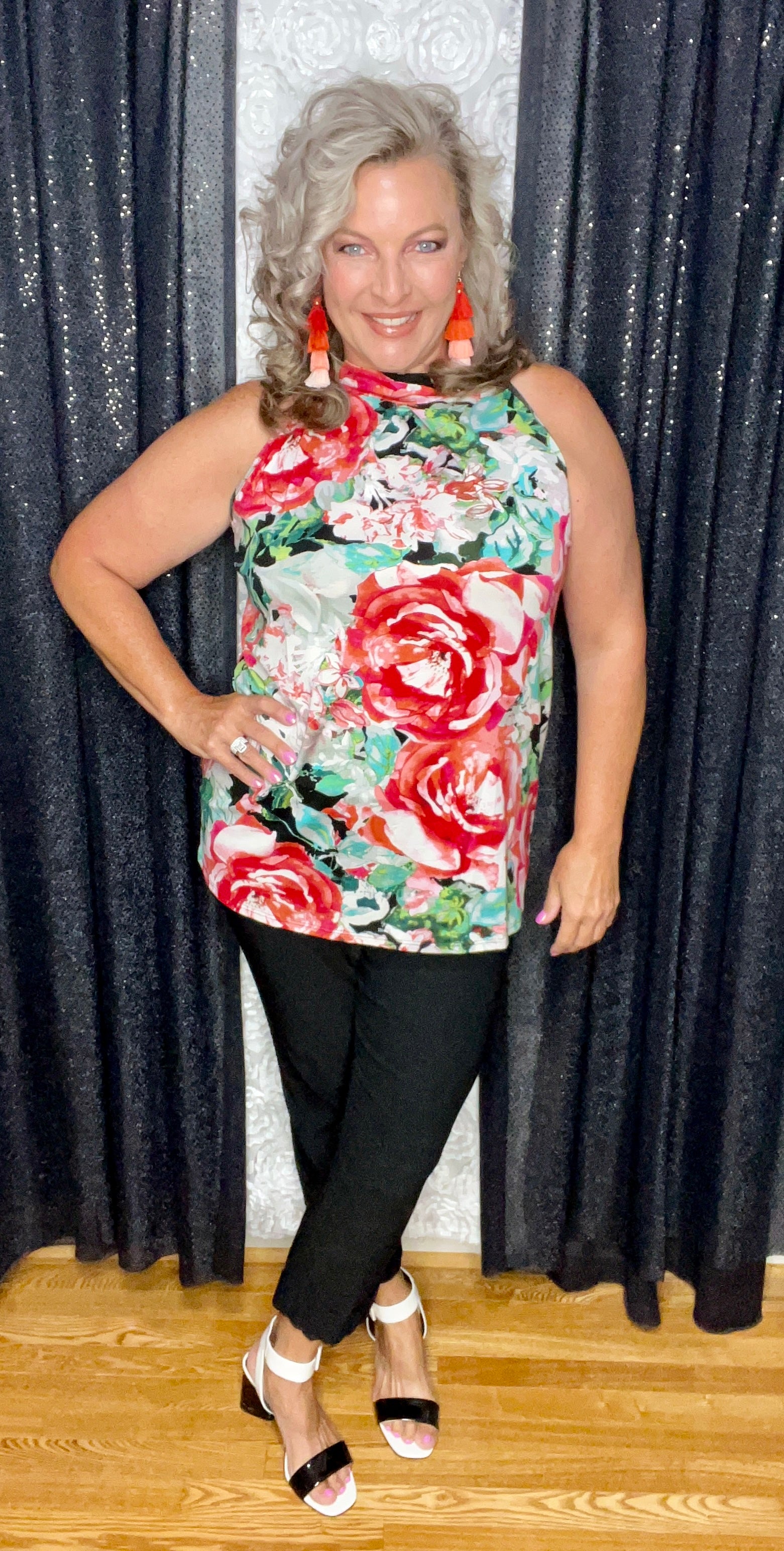 Sleeveless top with back neck tie. Bright floral pattern. 95% rayon and 5% spandex.