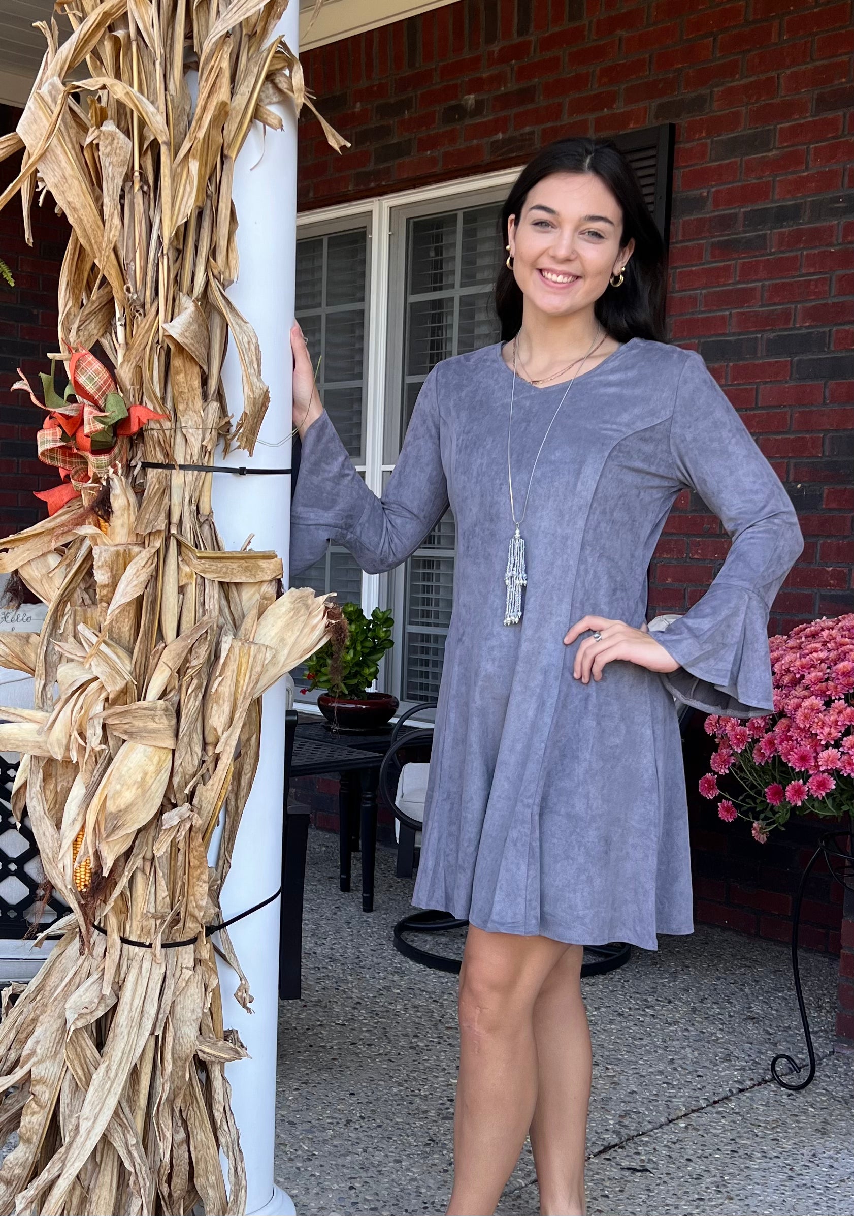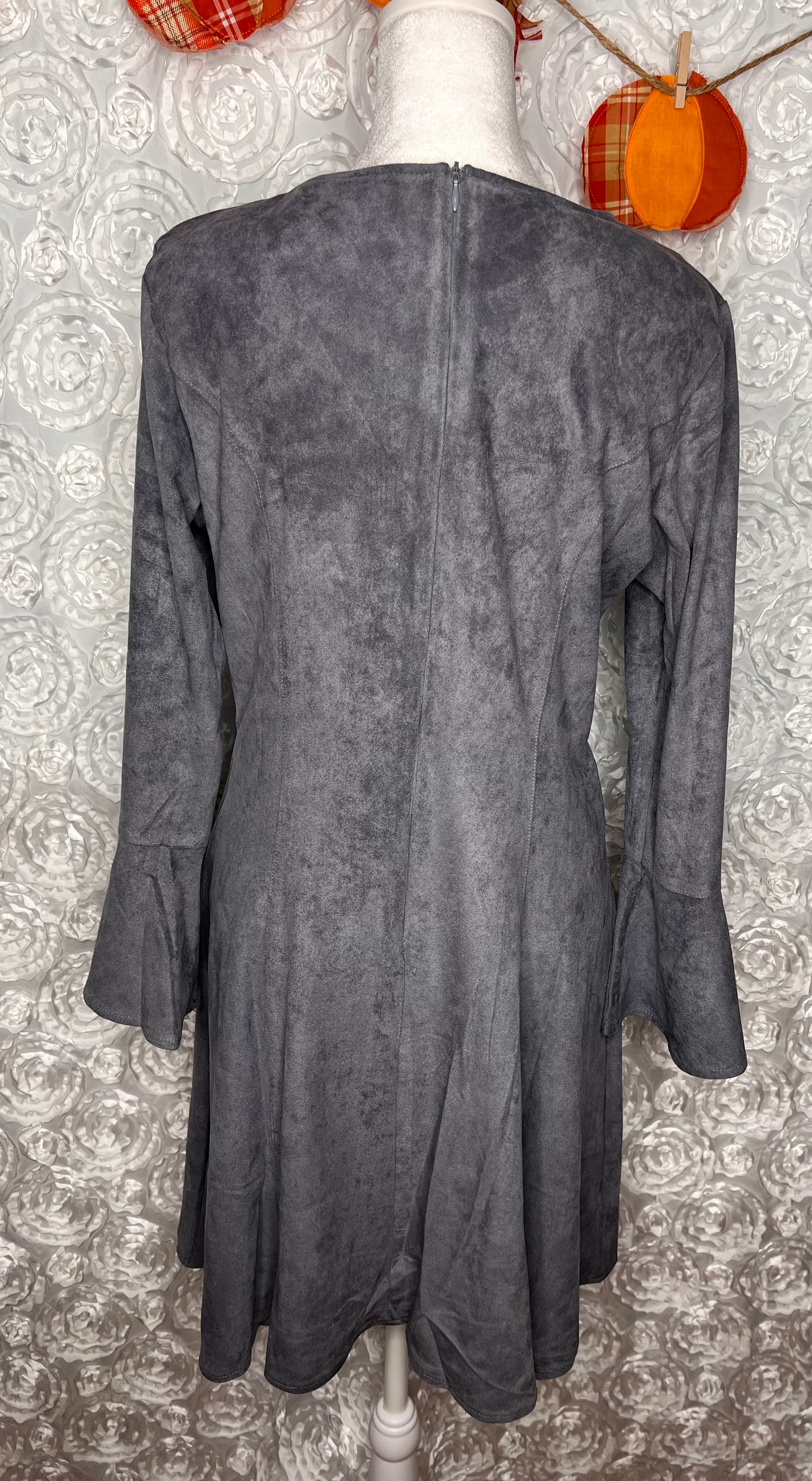 Soft suede feel fabric. Zippered back, bell sleeves, v-neck , in a classic gray color. 90% polyester and 10% spandex.