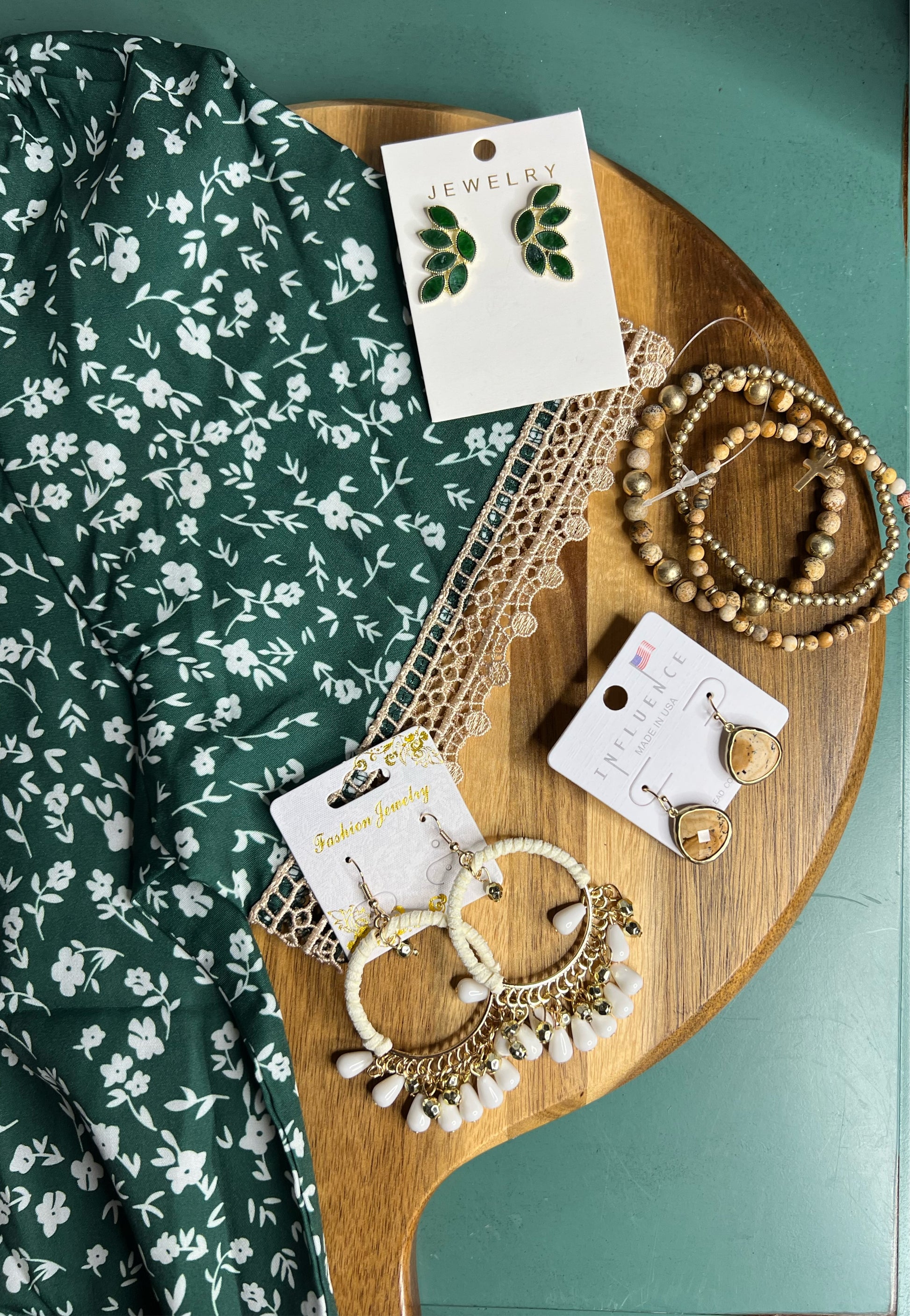 Rich green color with floral print. Tan lace trim in a flattering v-neck style. Perfect for work or a night out. 65% polyester and 35% cotton.