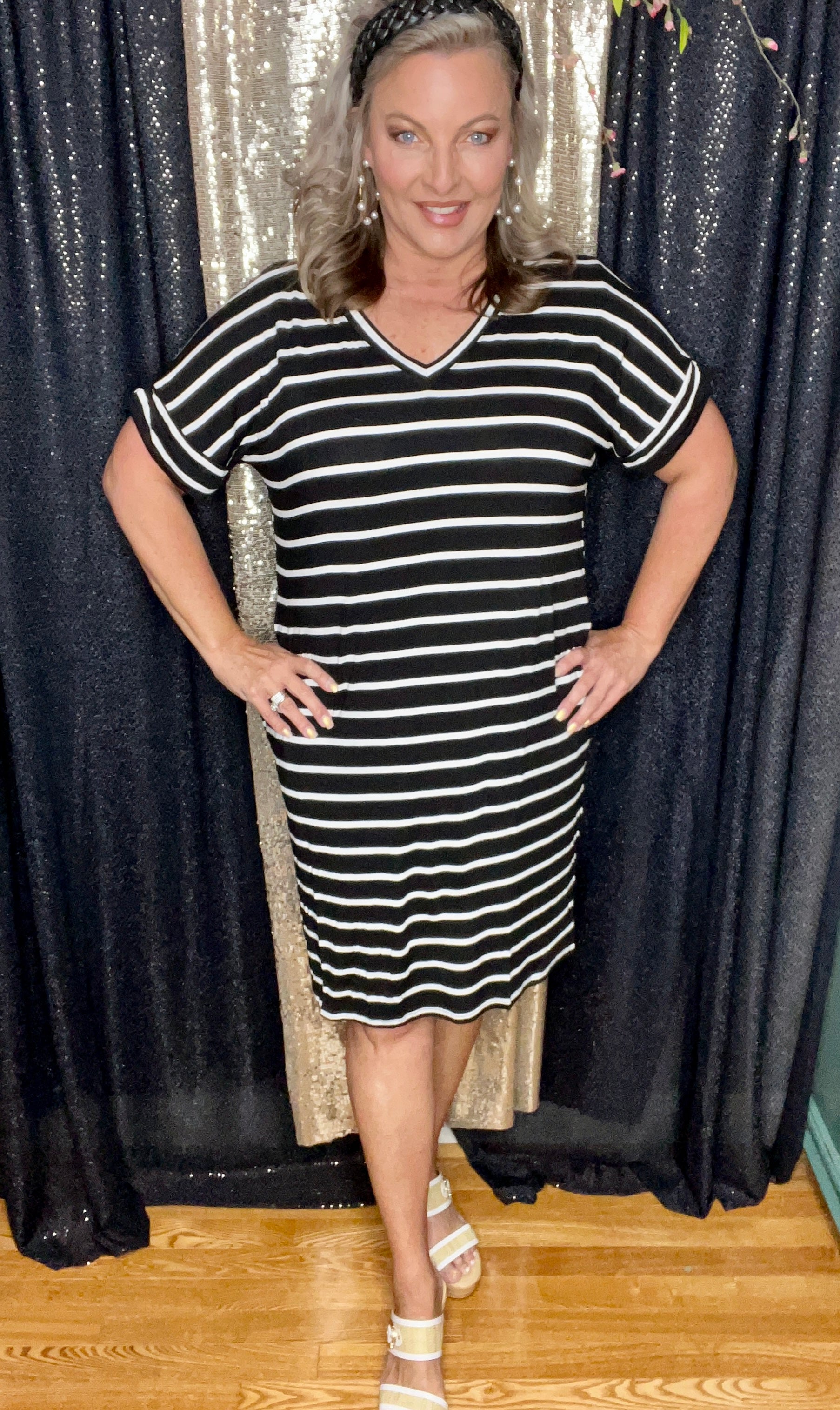Striped black and ivory pattern. V-neck style with rolled short sleeves and pockets! 95% rayon and 5% spandex.