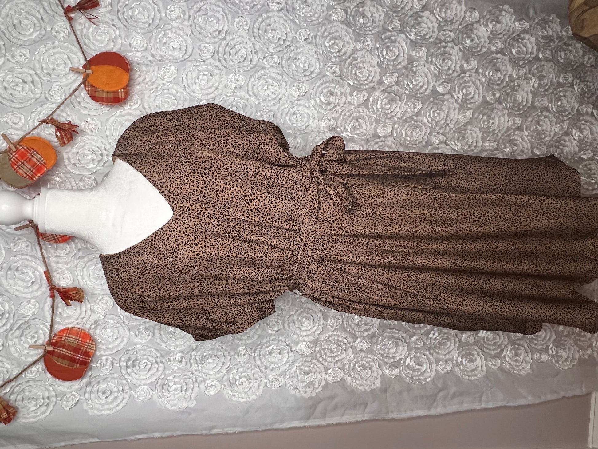 Leopard print accents on a neutral tan dress. Fully lined! 100% polyester. Medium thru large available.