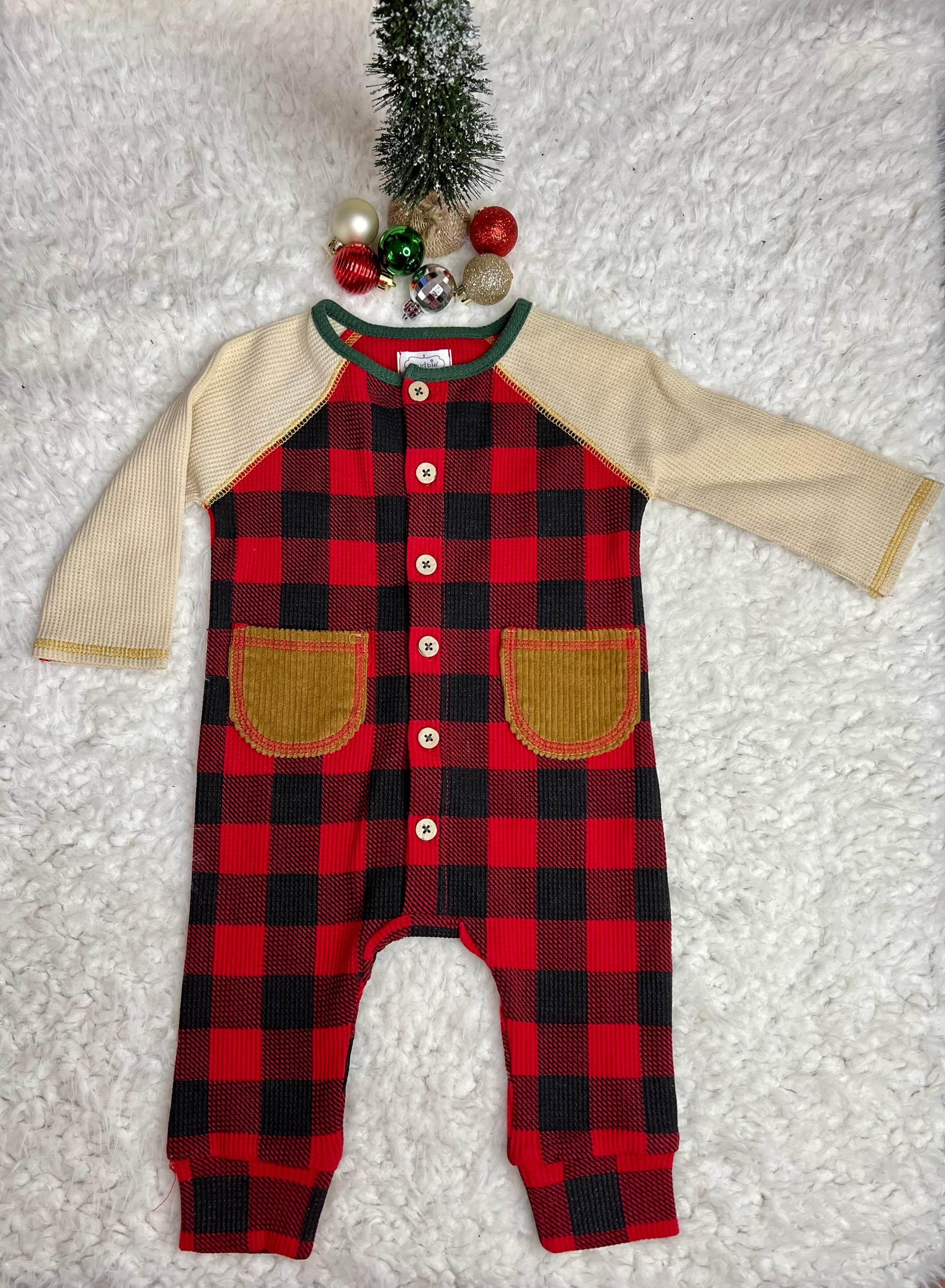 Mud Pie Sleeper sporting buffalo plaid, thermal sleeves, and corduroy pockets. Absolutely adorable.