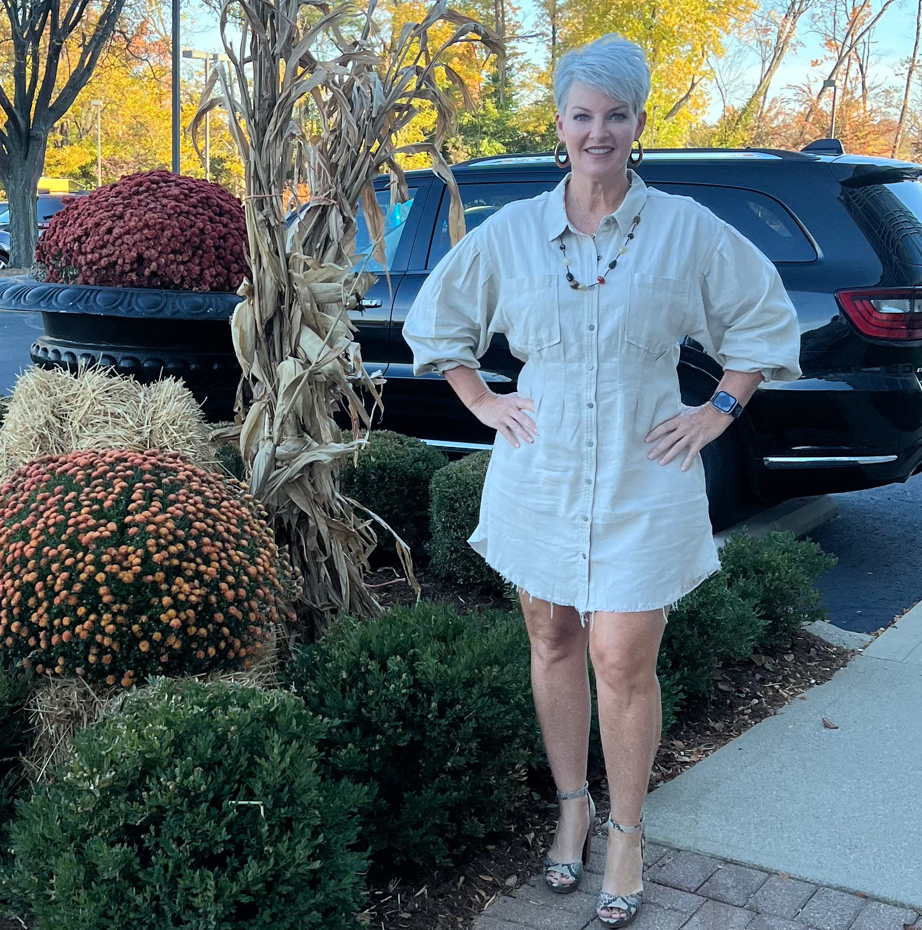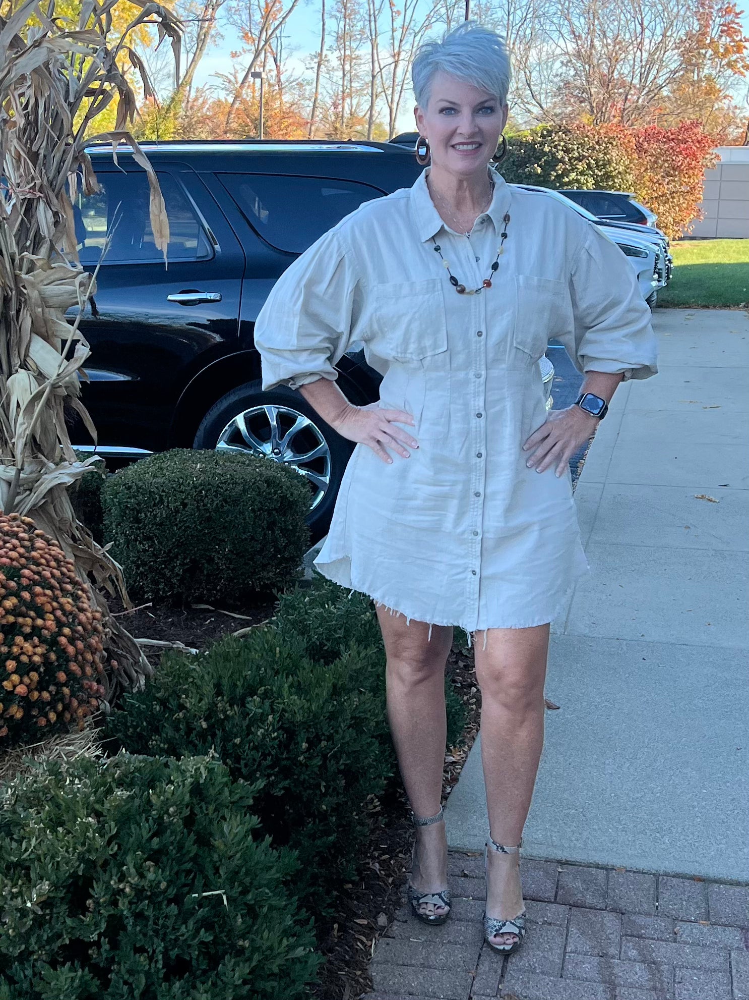 Tunic or dress.. in taupe. 55% linen and 45% viscose. Pairs with boots, tights, leggings or heels!