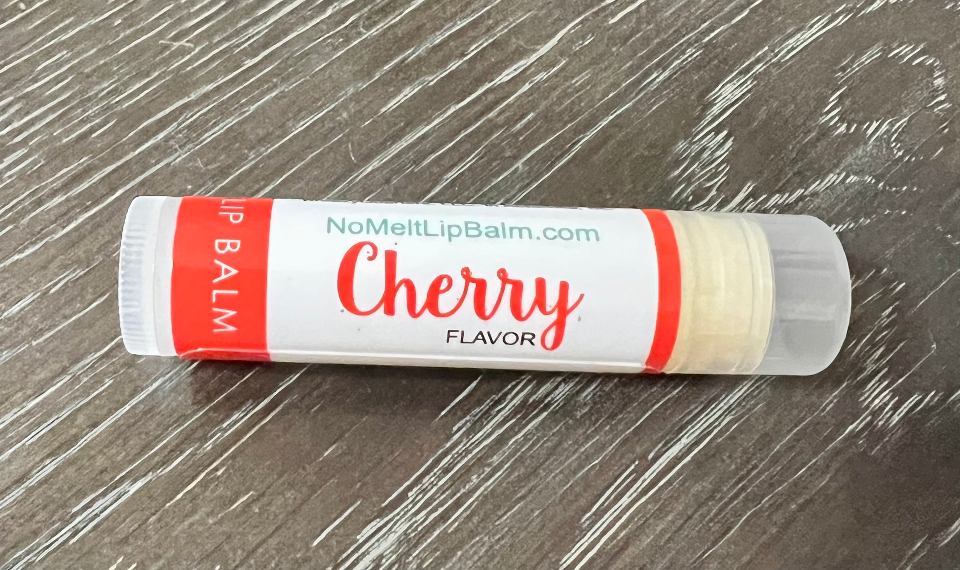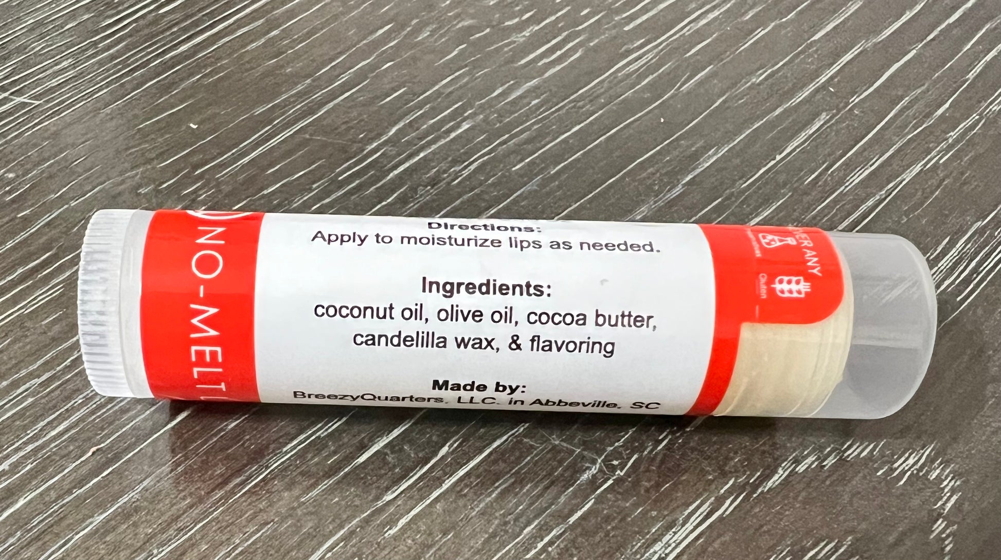 Moisturizing lip balm in fun fruity flavors. Ingredients: coconut oil, olive oil, cocoa butter, candelilia wax, and flavoring. Does not melt - STABLE IN HEAT up to 150 degree F.