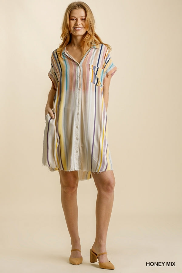 A light and airy t-shirt dress with a ragged edged hem. Easy outfit for work or date night when paired with wedge sandals. 100% Rayon