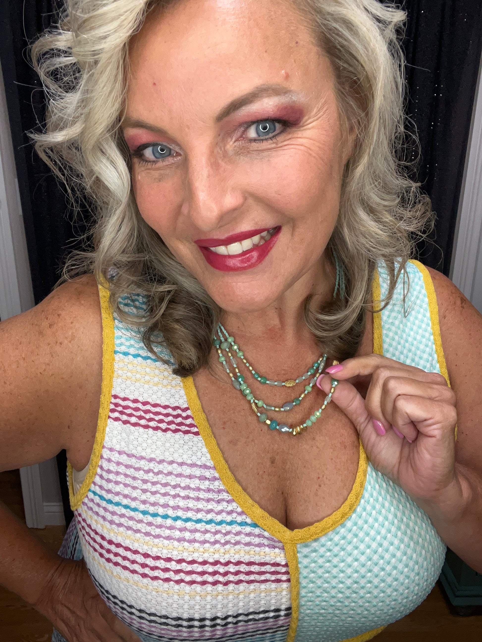 Colorful stripe and solid color block contrast, textured knit, v neckline, sleeveless, contrast binding detail throughout, relaxed fit, polyester/spandex