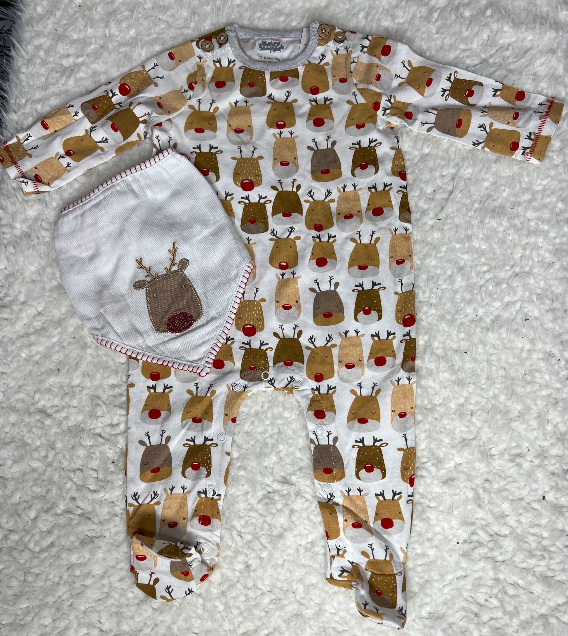 Mud Pie Holiday Sleeper with coordinating reindeer bib. Snap bottom.