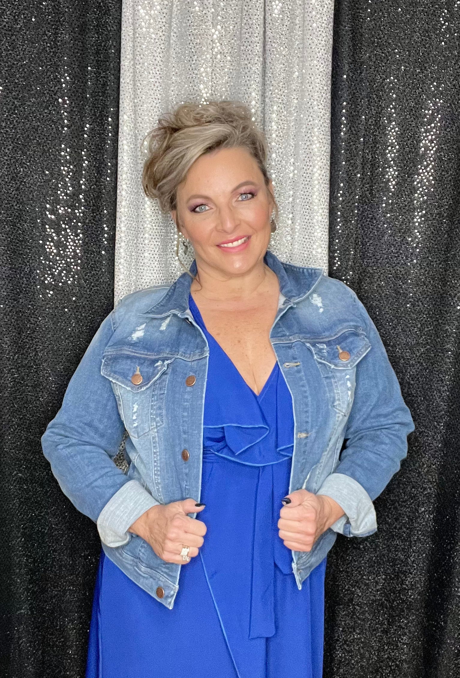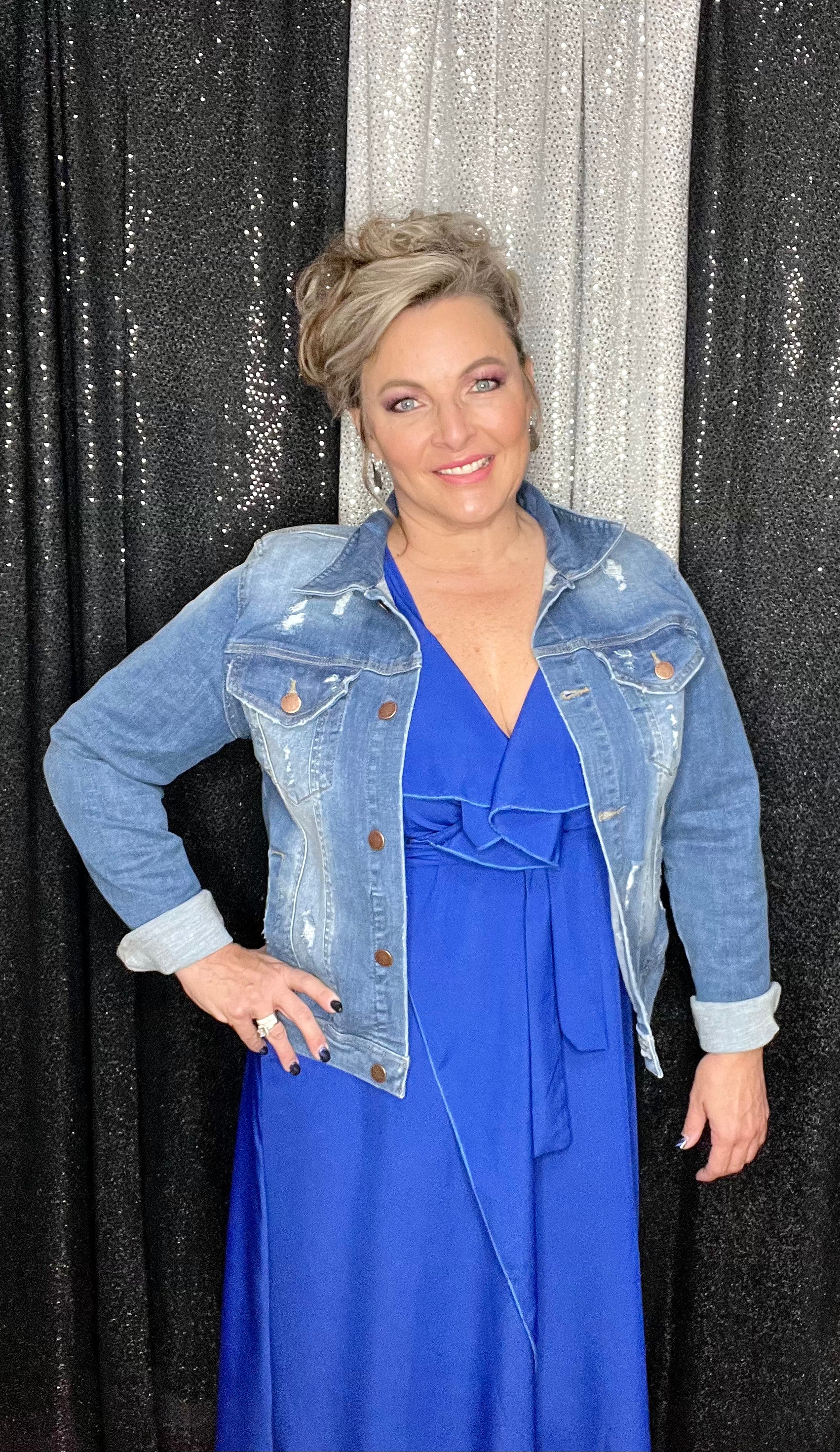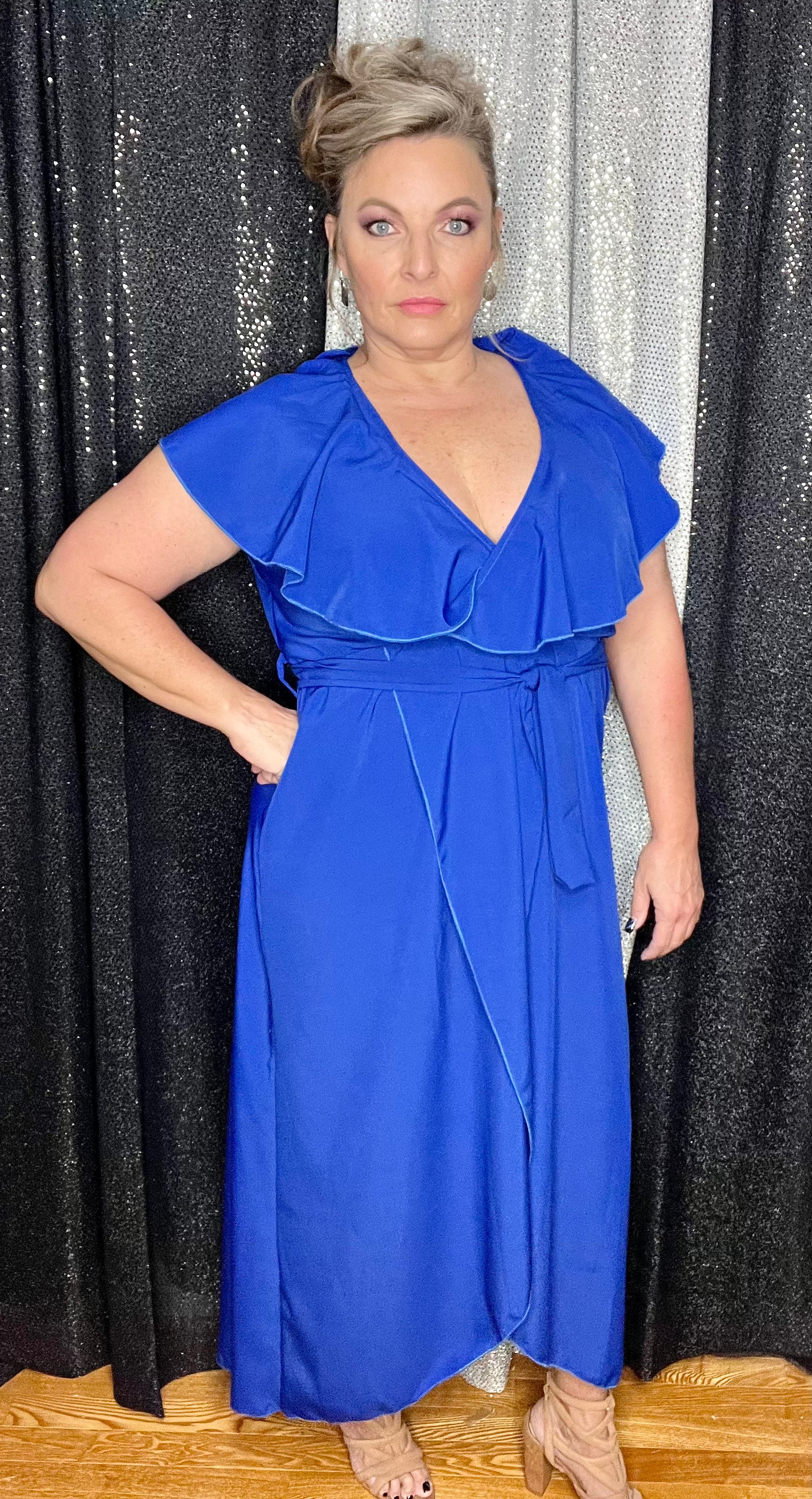 A classic royal blue color. Wrap style V-neck with a tie waist to accentuate those curves. 100% polyester