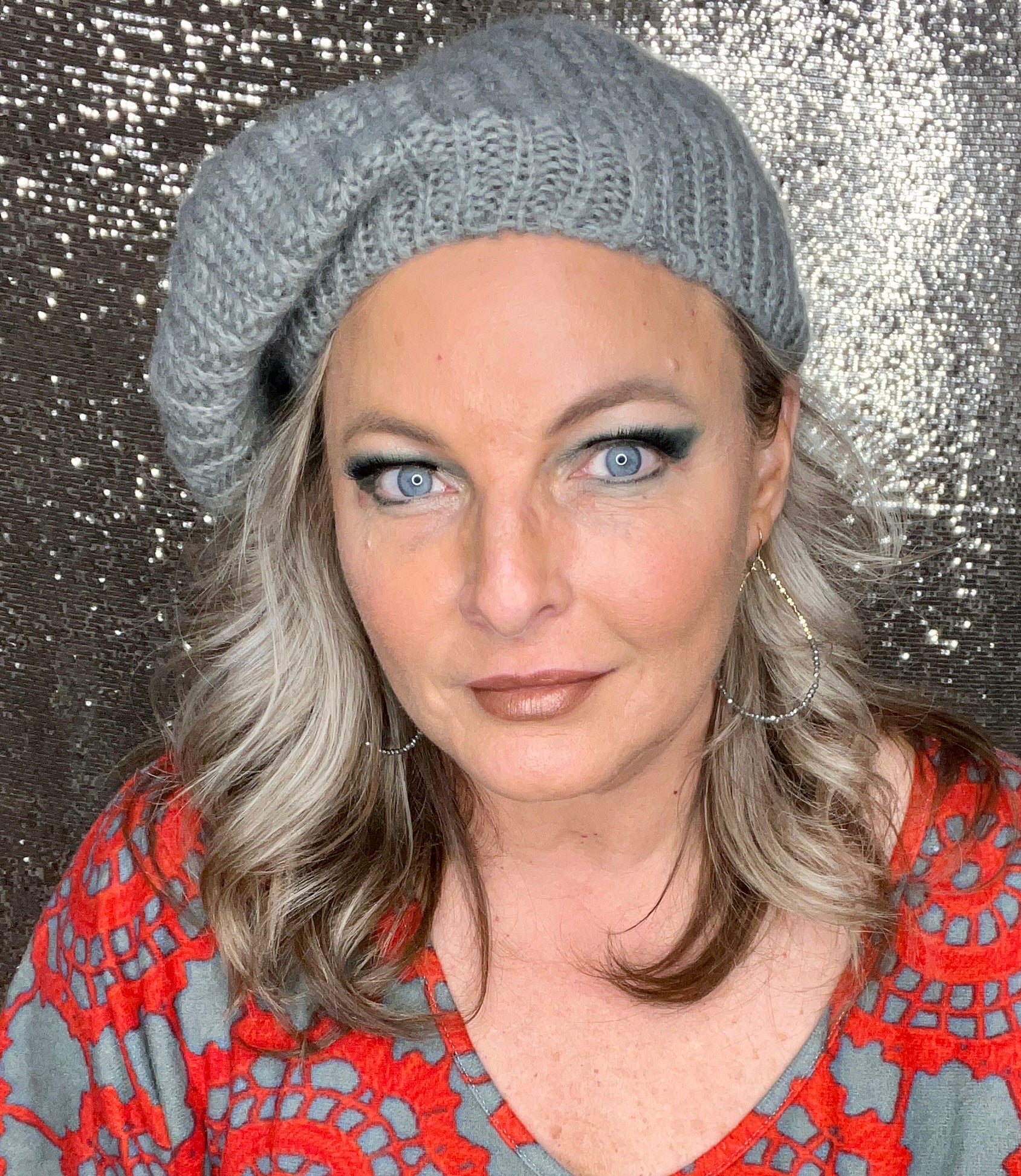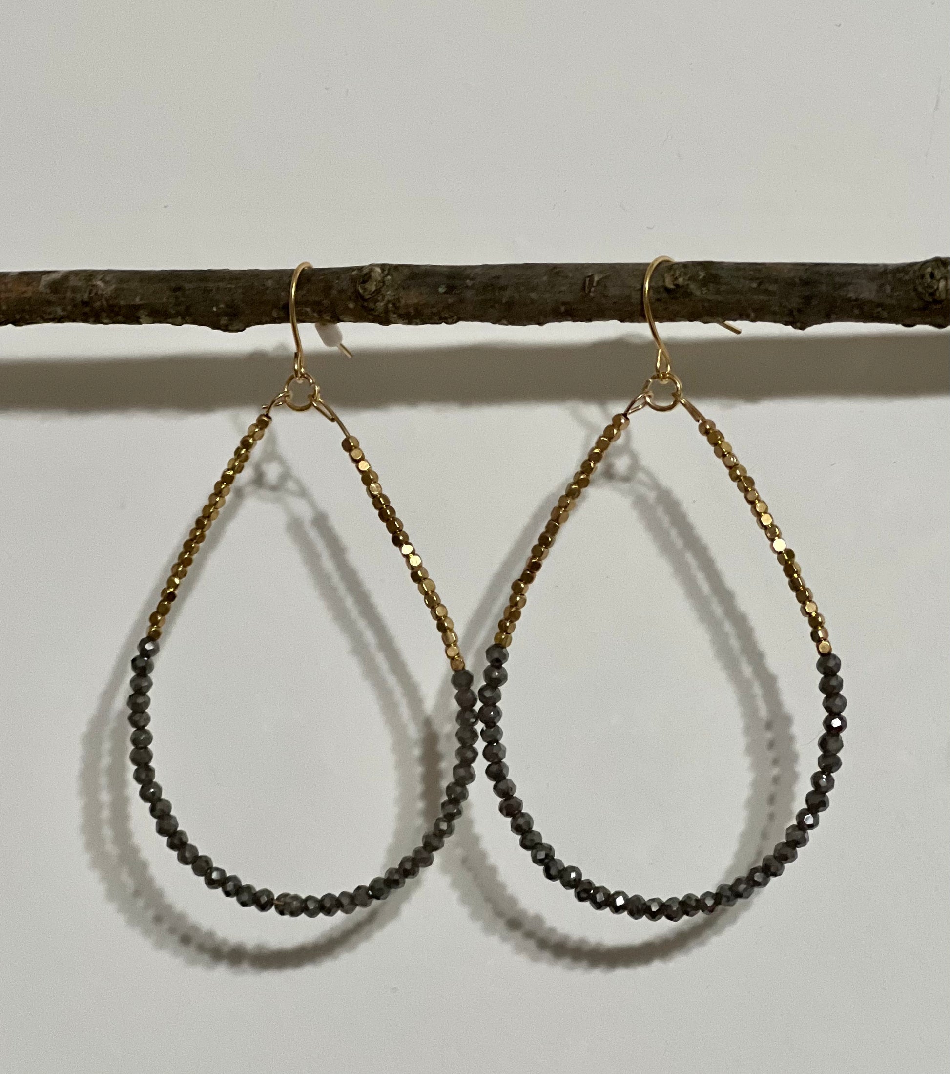 Gold with gray beads. Teardrop shape and movement to catch the light!