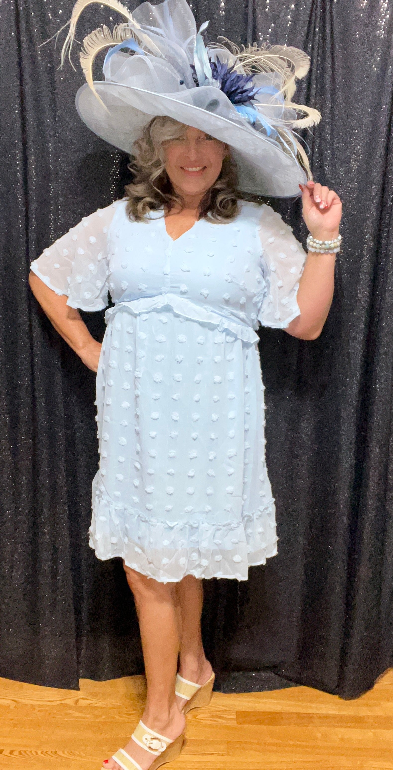 Swiss dot dress in a baby blue. Light and airy feel. 100% polyester.