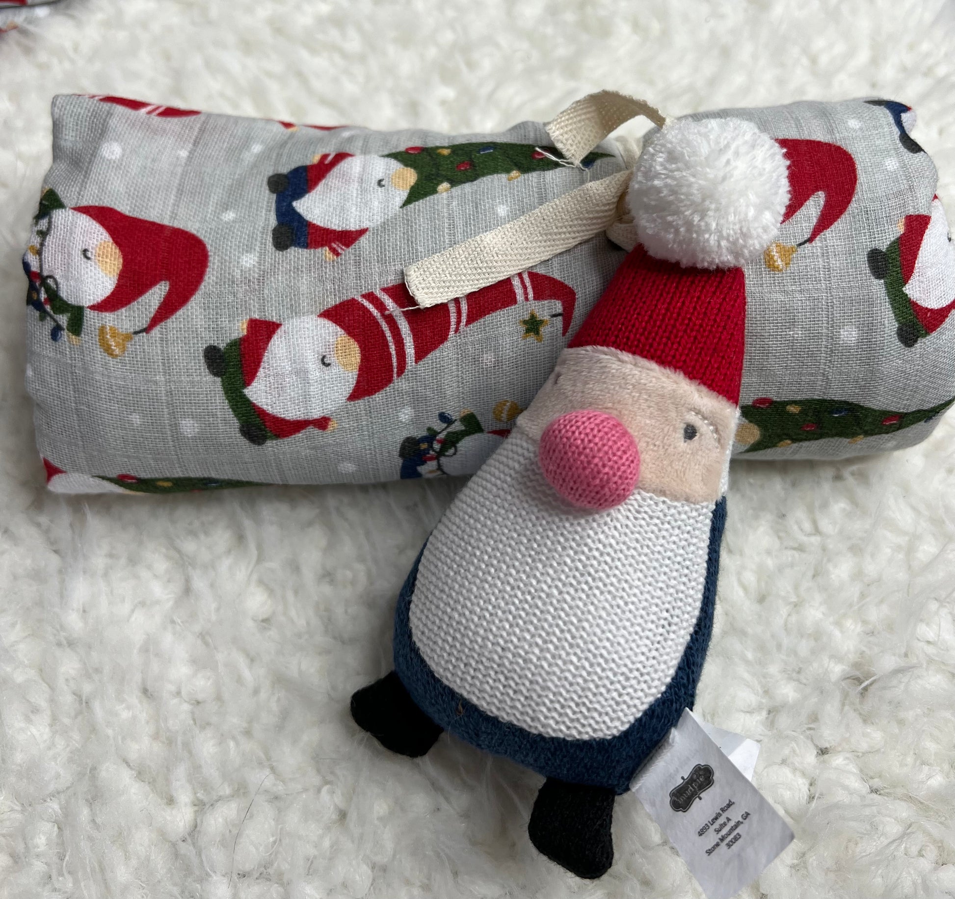 Mud Pie matching Gnome muslin blanket and gnome rattle. Ups the cuteness and the warm and snuggly quotient.